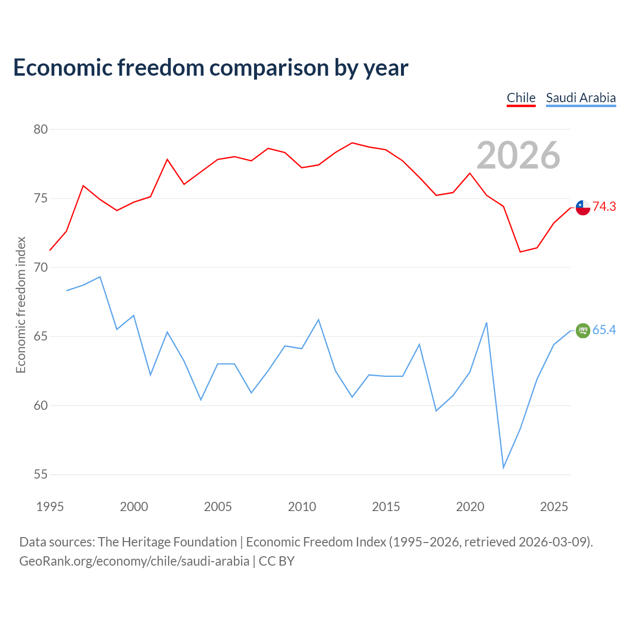 The Economic Freedom Index for Chile is 74.3, ranking 20/197, compared to 65.4 for Saudi Arabia, ranking 65/197. The chart above displays a comparison of annual changes in economic freedom indexes.