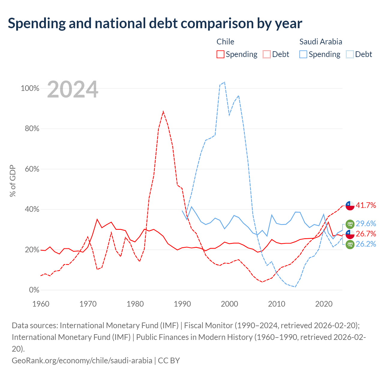 Chile has $138B in government debt (41.7% of GDP), compared to $324B (26.2% of GDP) in Saudi Arabia.