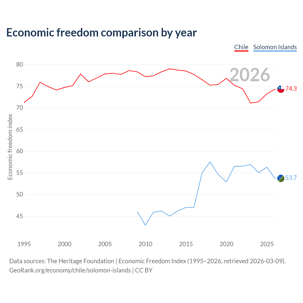 The Economic Freedom Index for Chile is 74.3, ranking 20/197, compared to 53.7 for the Solomon Islands, ranking 137/197. The chart above displays a comparison of annual changes in economic freedom indexes.