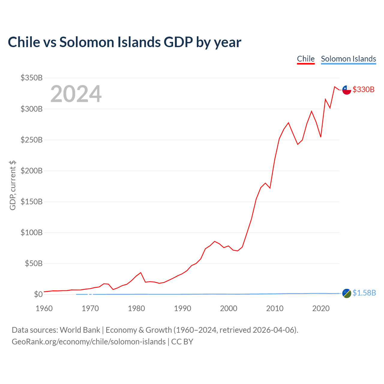 Chile has a GDP of $330B compared to $1.58B for the Solomon Islands, ranking 45/197 and 182/197 by economy size, respectively.