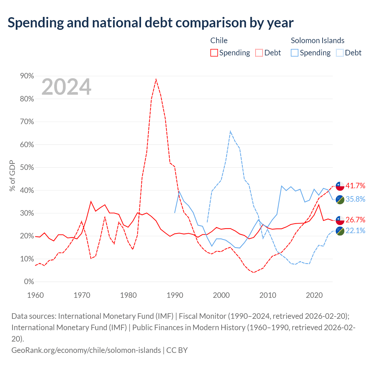 Chile has $138B in government debt (41.7% of GDP), compared to $350M (22.1% of GDP) in the Solomon Islands.