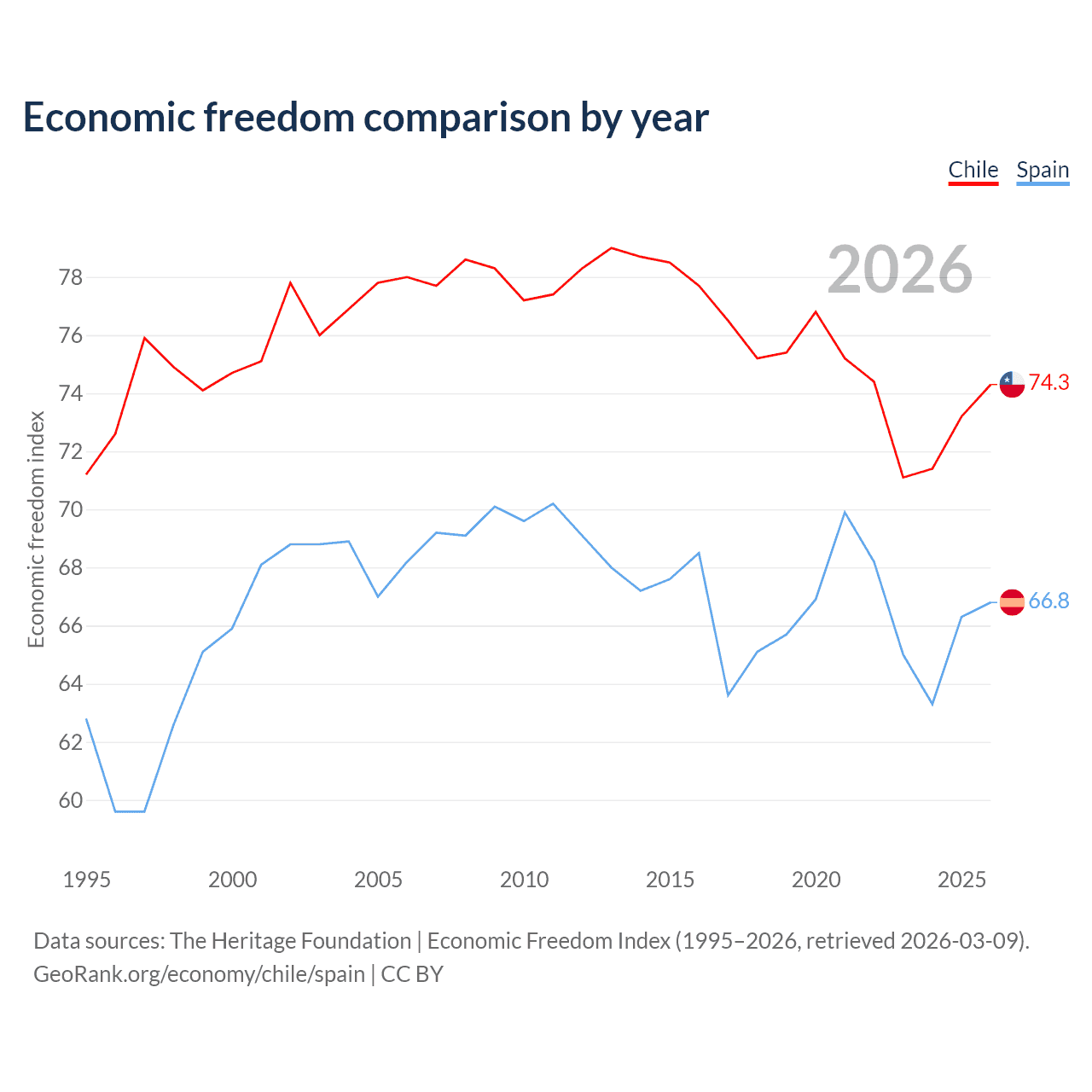 The Economic Freedom Index for Chile is 74.3, ranking 20/197, compared to 66.8 for Spain, ranking 59/197. The chart above displays a comparison of annual changes in economic freedom indexes.