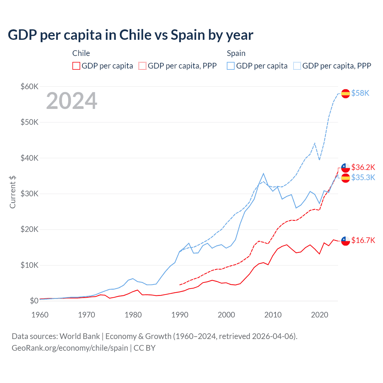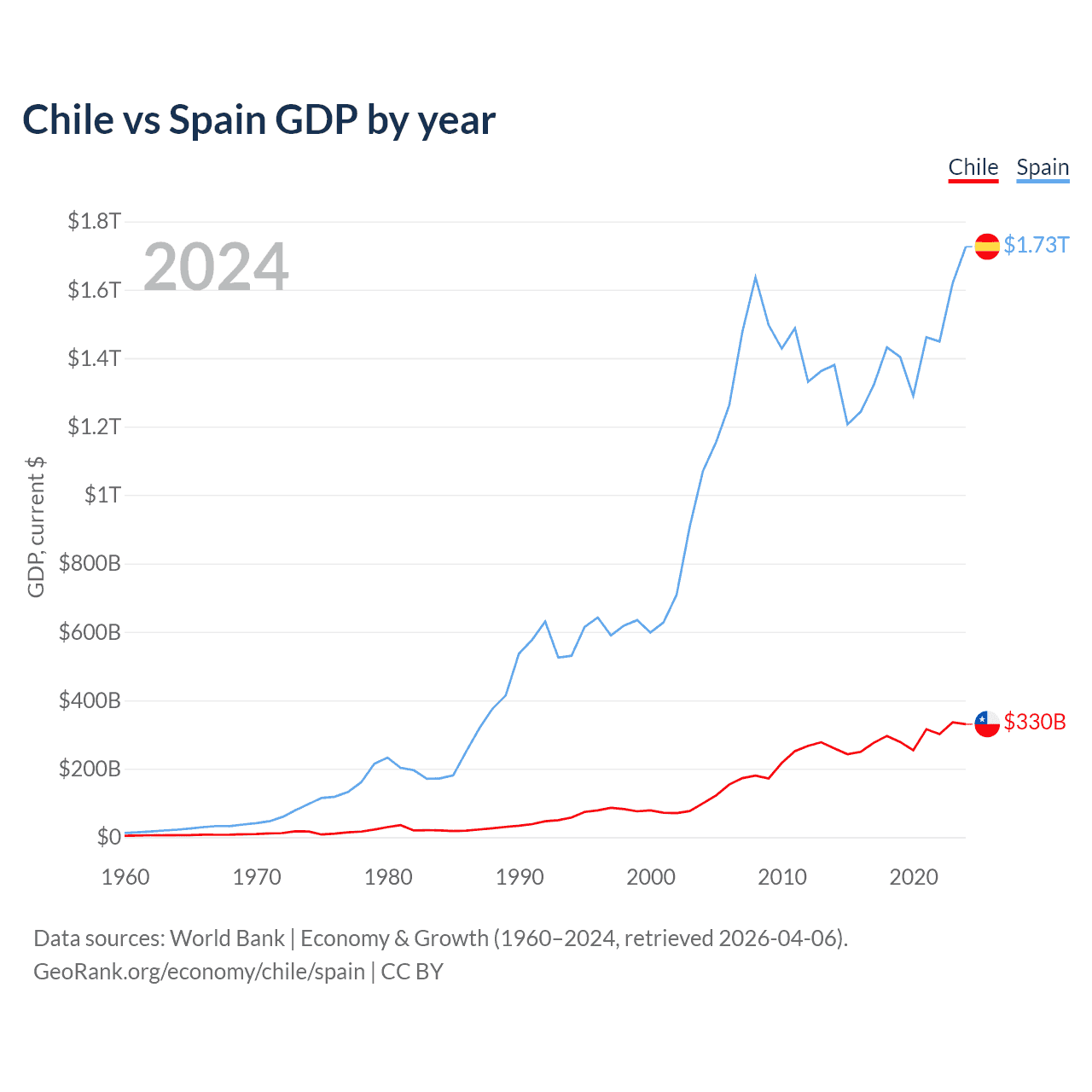 Chile vs Spain GDP by year