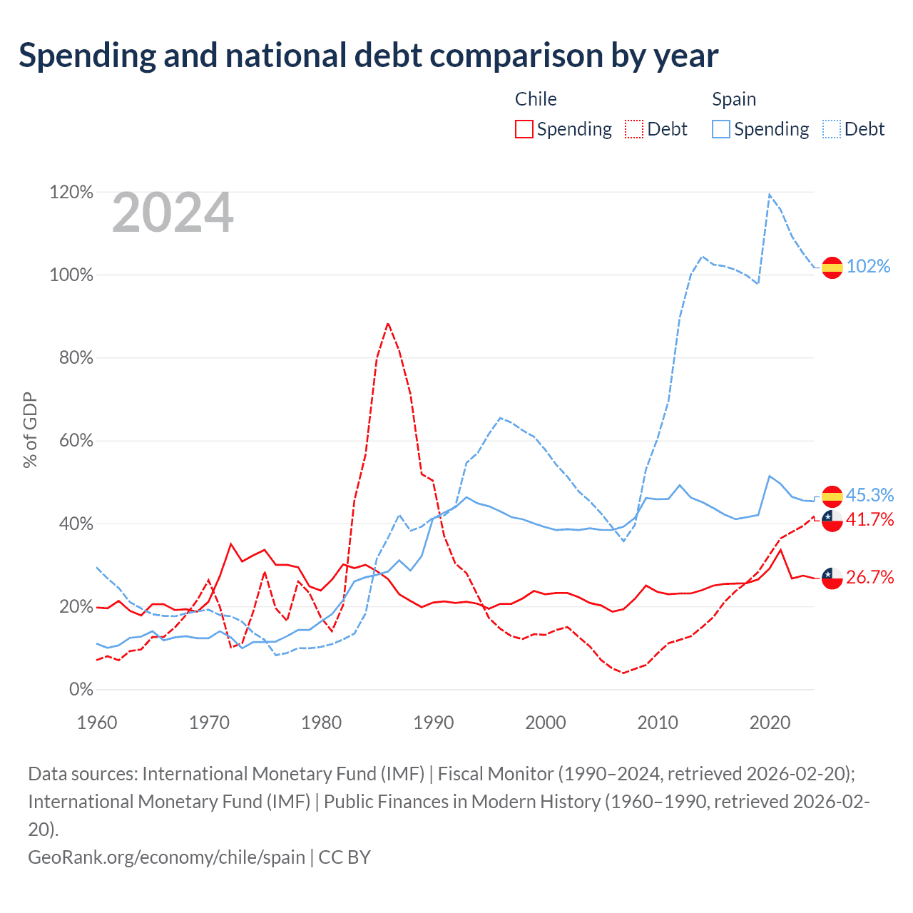 Chile has $138B in government debt (41.7% of GDP), compared to $1.75T (101.6% of GDP) in Spain.