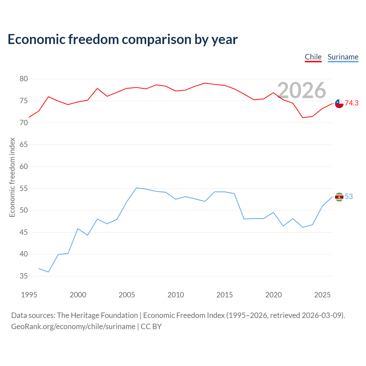 The Economic Freedom Index for Chile is 74.3, ranking 20/197, compared to 53 for Suriname, ranking 143/197. The chart above displays a comparison of annual changes in economic freedom indexes.
