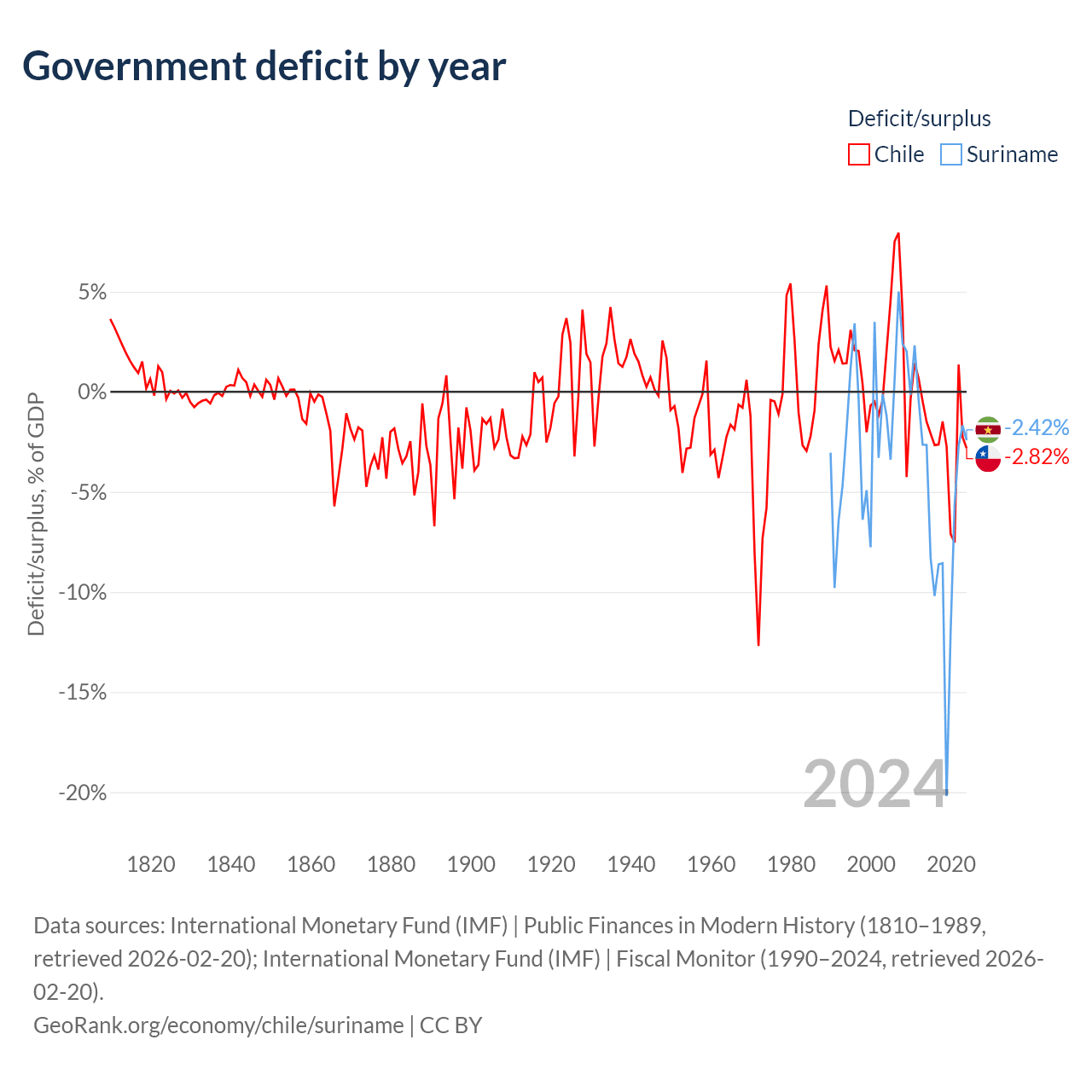 Chile has a GDP of $330B compared to $4.42B for Suriname, ranking 45/197 and 164/197 by economy size, respectively.