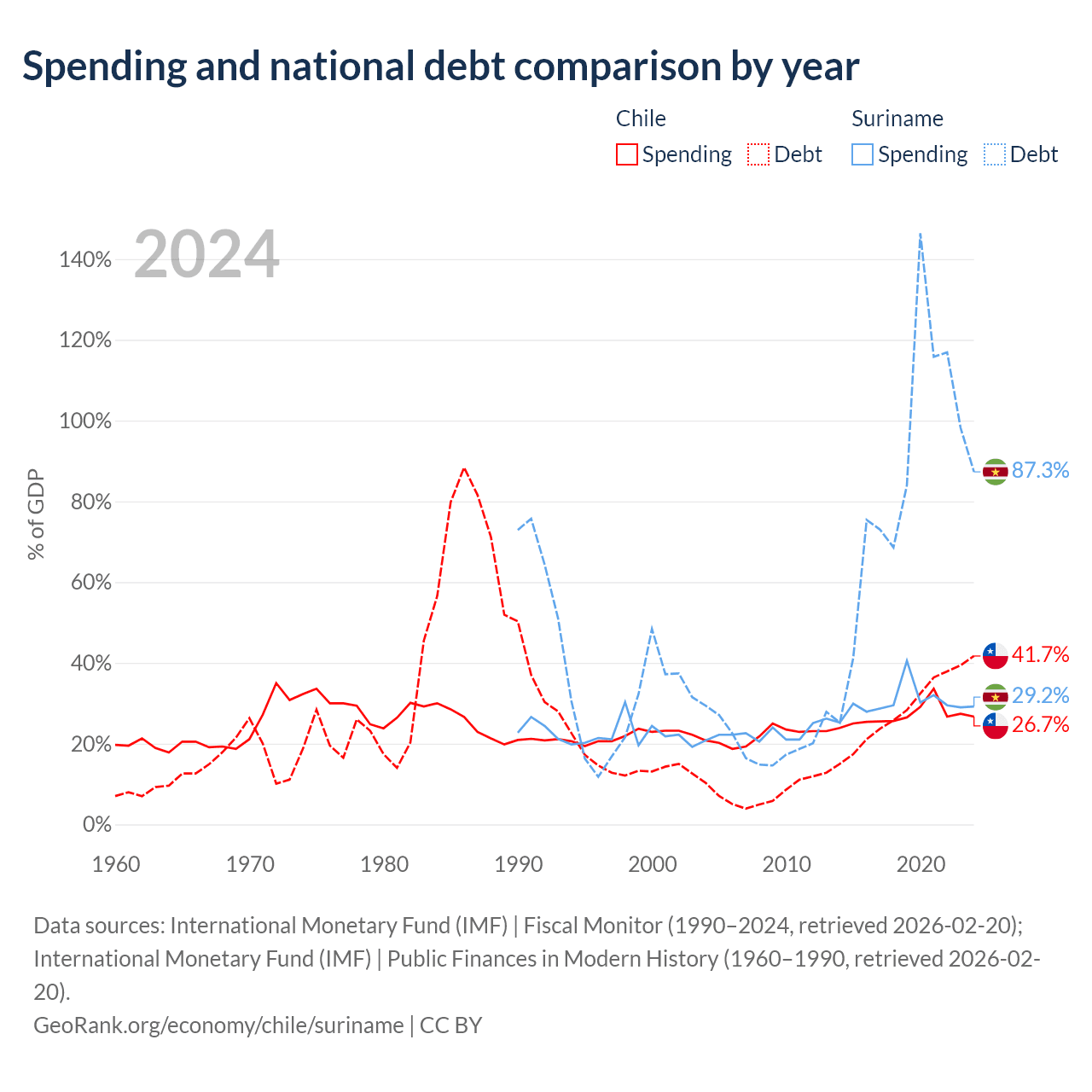 Chile has $138B in government debt (41.7% of GDP), compared to $3.86B (87.3% of GDP) in Suriname.