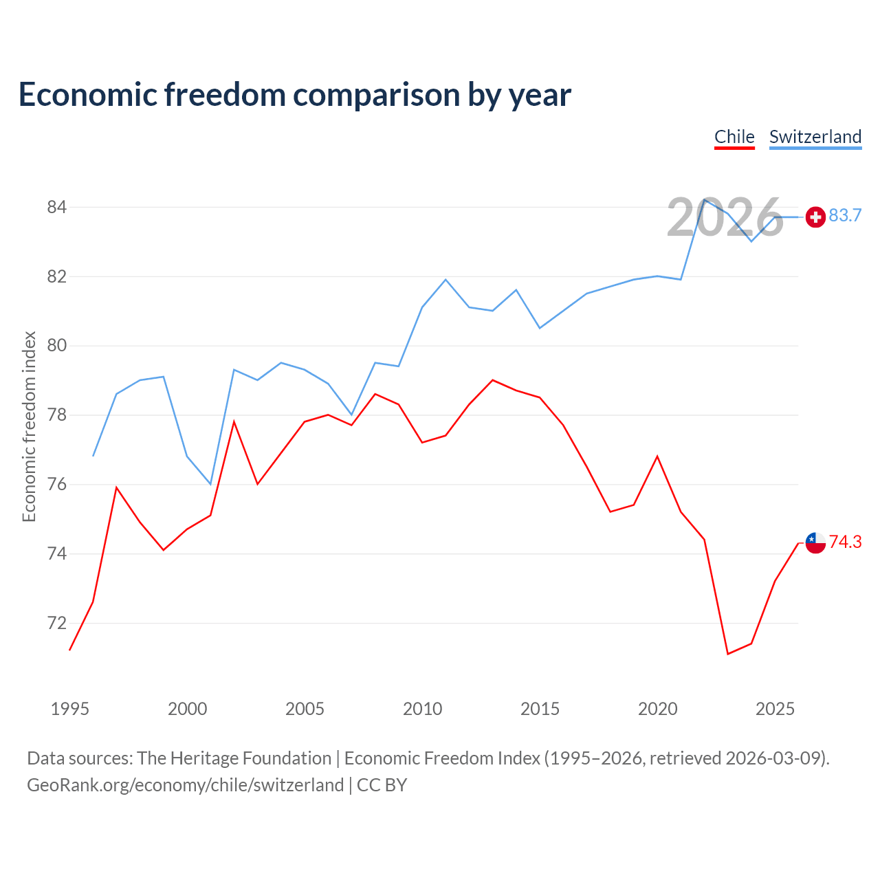 The Economic Freedom Index for Chile is 74.3, ranking 20/197, compared to 83.7 for Switzerland, ranking 2/197. The chart above displays a comparison of annual changes in economic freedom indexes.