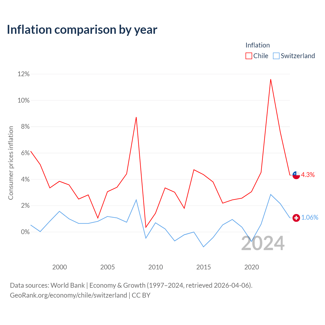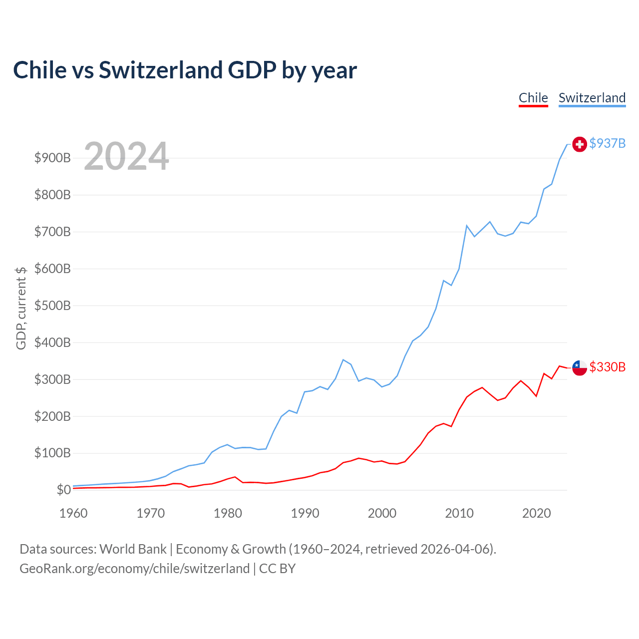 Chile has a GDP of $330B compared to $937B for Switzerland, ranking 45/197 and 20/197 by economy size, respectively.