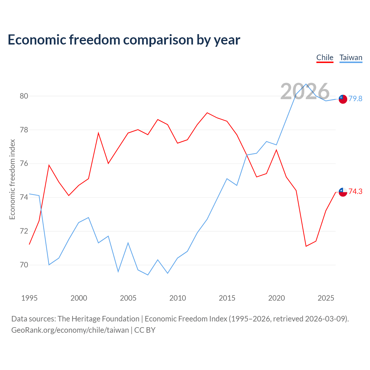 The Economic Freedom Index for Chile is 74.3, ranking 20/197, compared to 79.8 for Taiwan, ranking 6/197. The chart above displays a comparison of annual changes in economic freedom indexes.