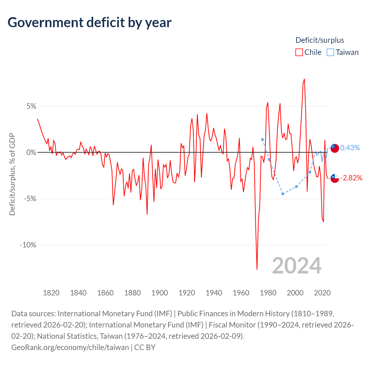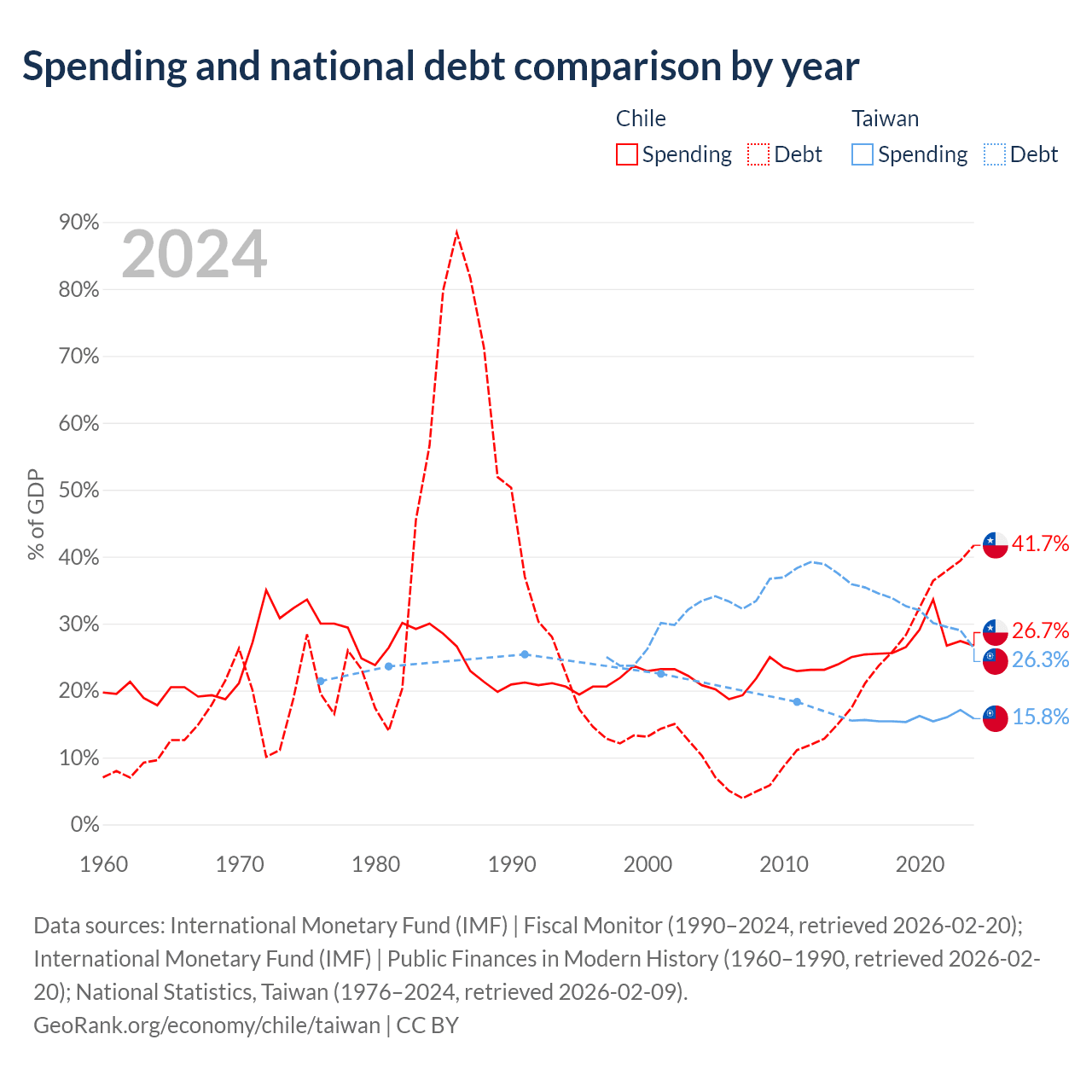 Chile has $138B in government debt (41.7% of GDP), compared to $211B (26.3% of GDP) in Taiwan.