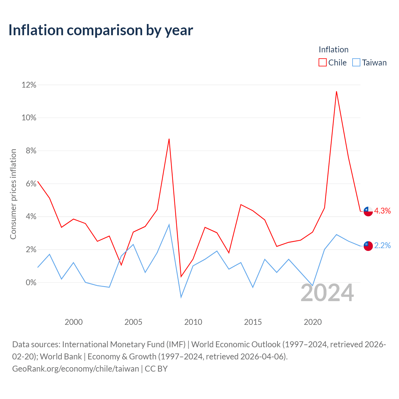 Chile has a GDP of $330B compared to $802B for Taiwan, ranking 45/197 and 22/197 by economy size, respectively.