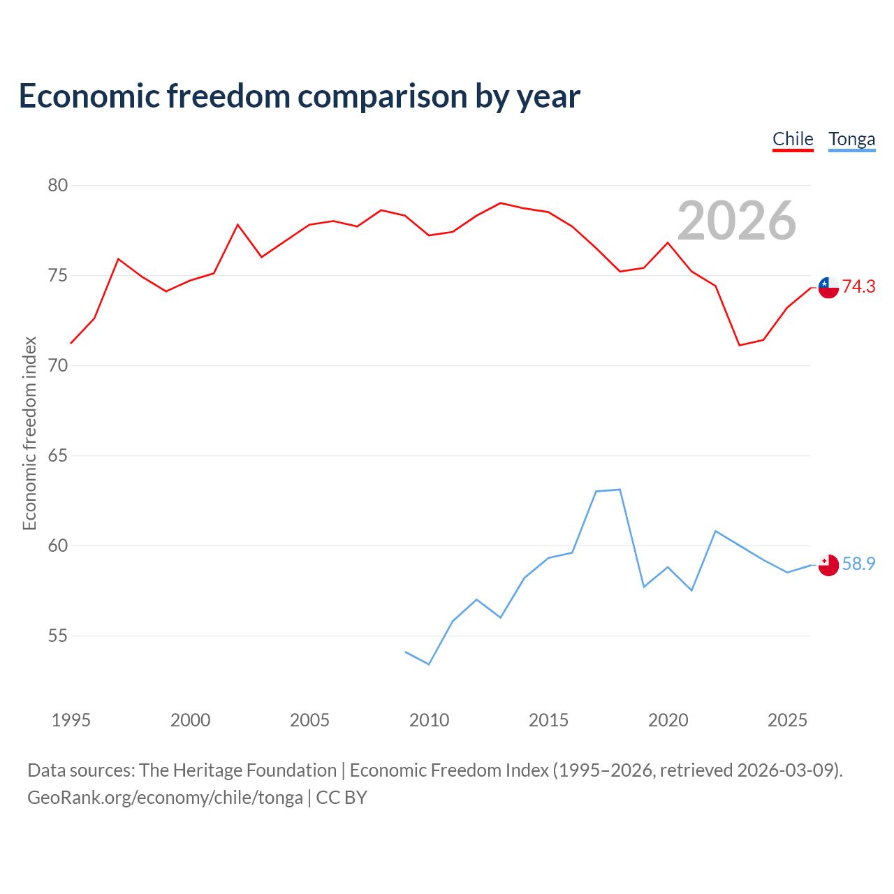 The Economic Freedom Index for Chile is 74.3, ranking 20/197, compared to 58.9 for Tonga, ranking 107/197. The chart above displays a comparison of annual changes in economic freedom indexes.