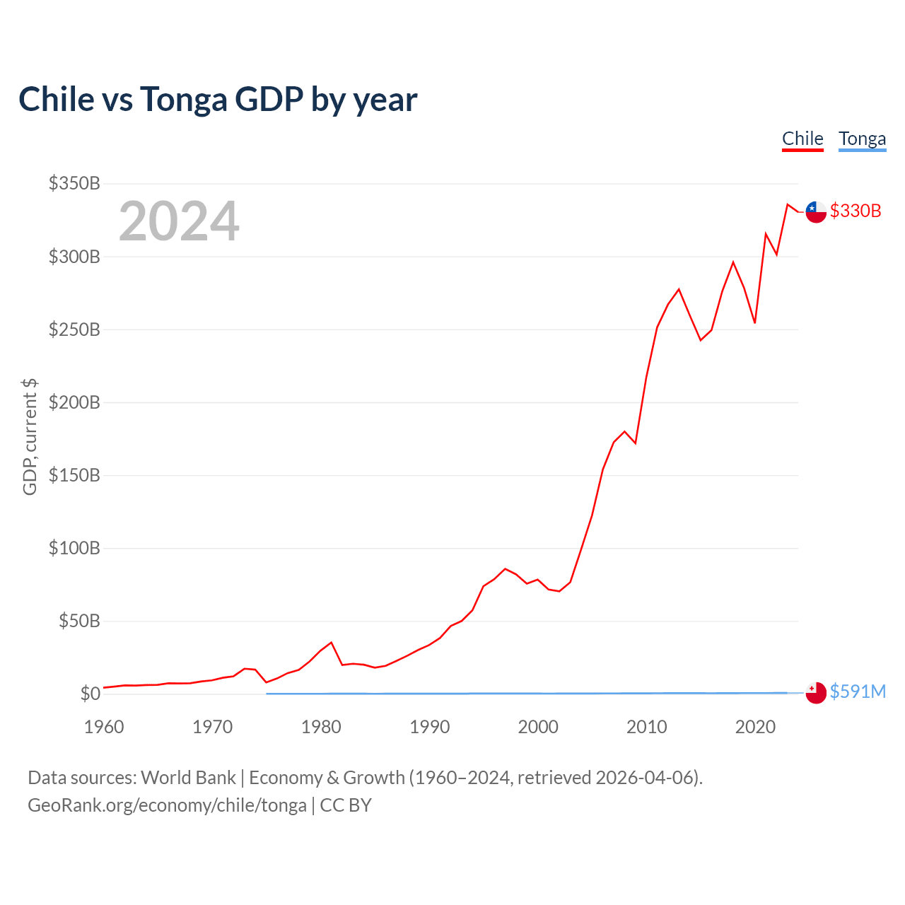 Chile has a GDP of $330B compared to $591M for Tonga, ranking 45/197 and 191/197 by economy size, respectively.