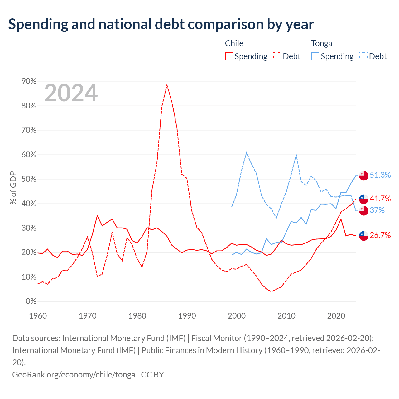 Chile has $138B in government debt (41.7% of GDP), compared to $256M (37% of GDP) in Tonga.