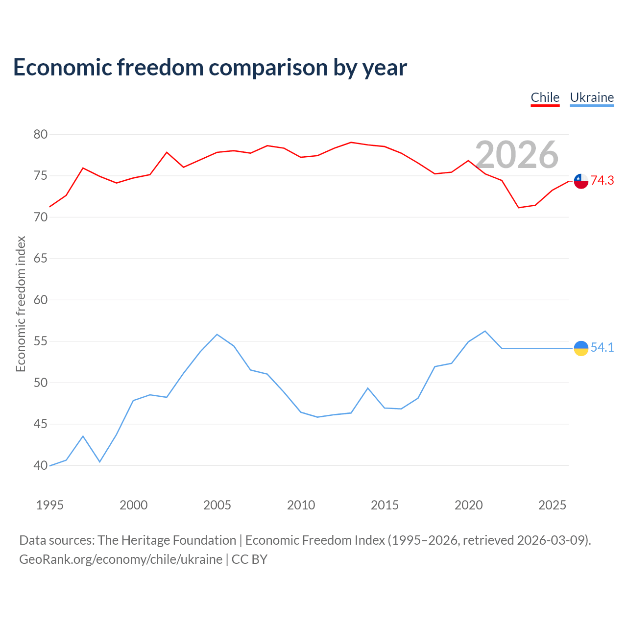 The Economic Freedom Index for Chile is 74.3, ranking 20/197, compared to 54.1 for Ukraine, ranking 135/197. The chart above displays a comparison of annual changes in economic freedom indexes.