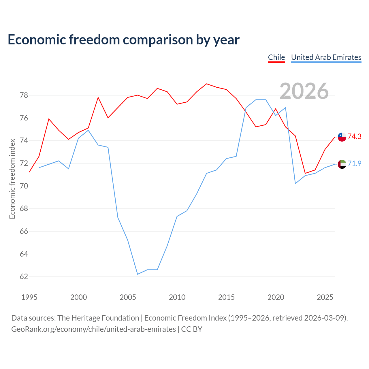 Data sources: The Heritage Foundation | Economic Freedom Index (1995–2026, retrieved 2026-03-09).