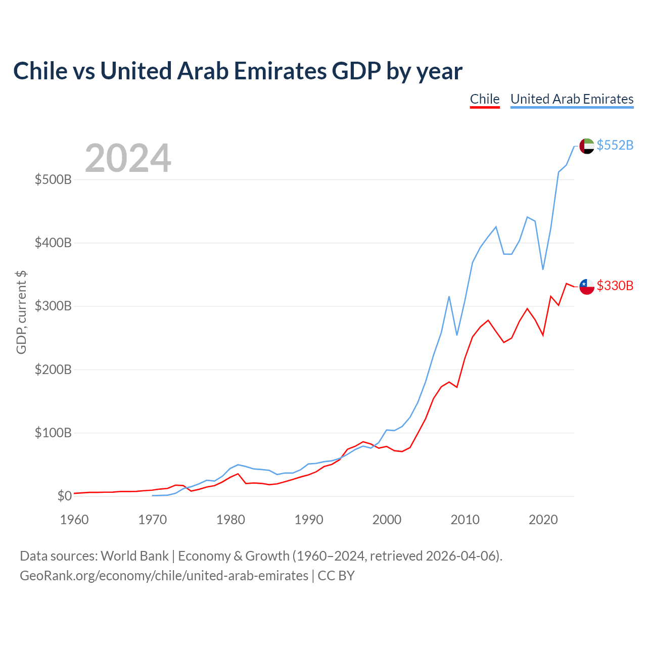 Chile has a GDP of $330B compared to $552B for the United Arab Emirates, ranking 45/197 and 27/197 by economy size, respectively.