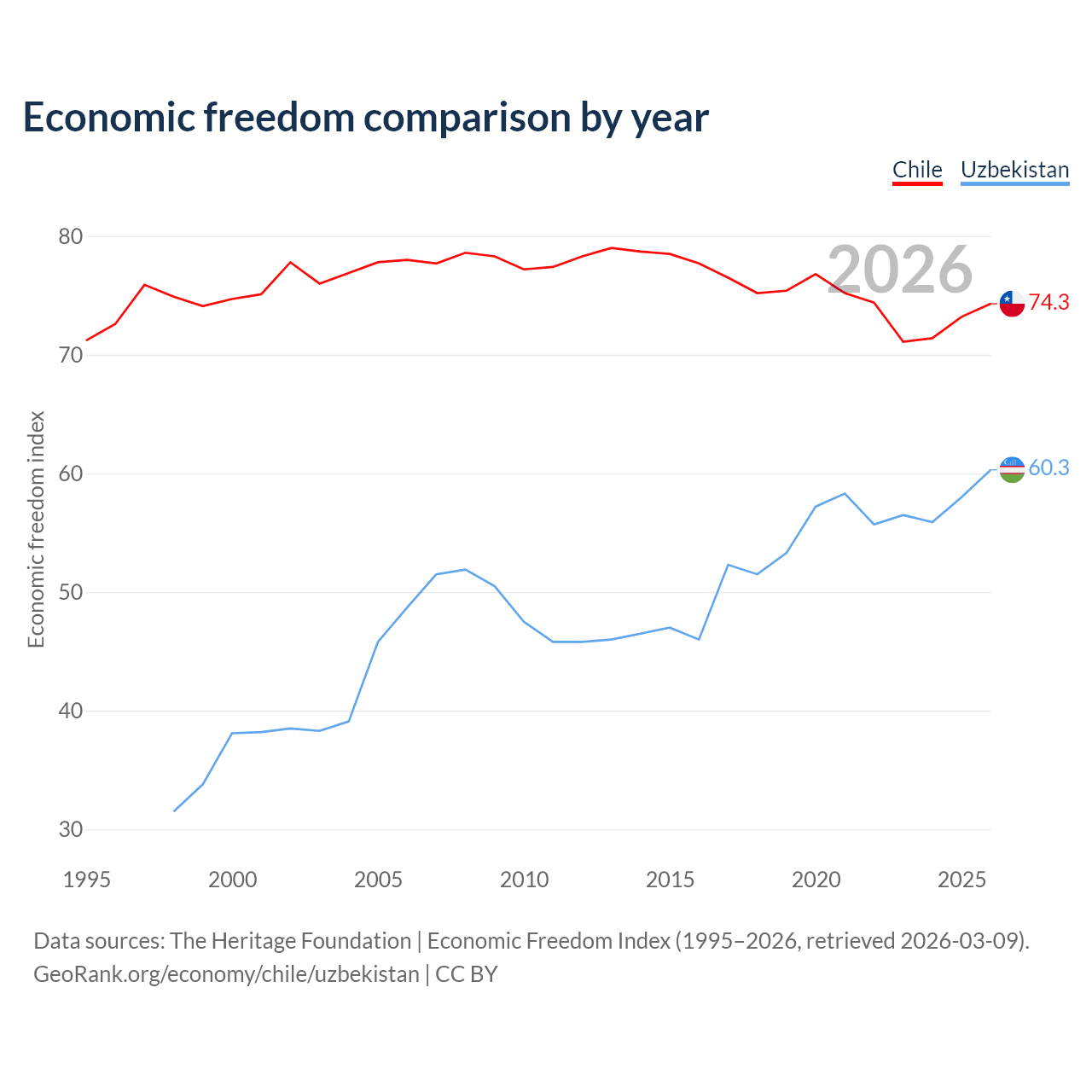 The Economic Freedom Index for Chile is 74.3, ranking 20/197, compared to 60.3 for Uzbekistan, ranking 94/197. The chart above displays a comparison of annual changes in economic freedom indexes.