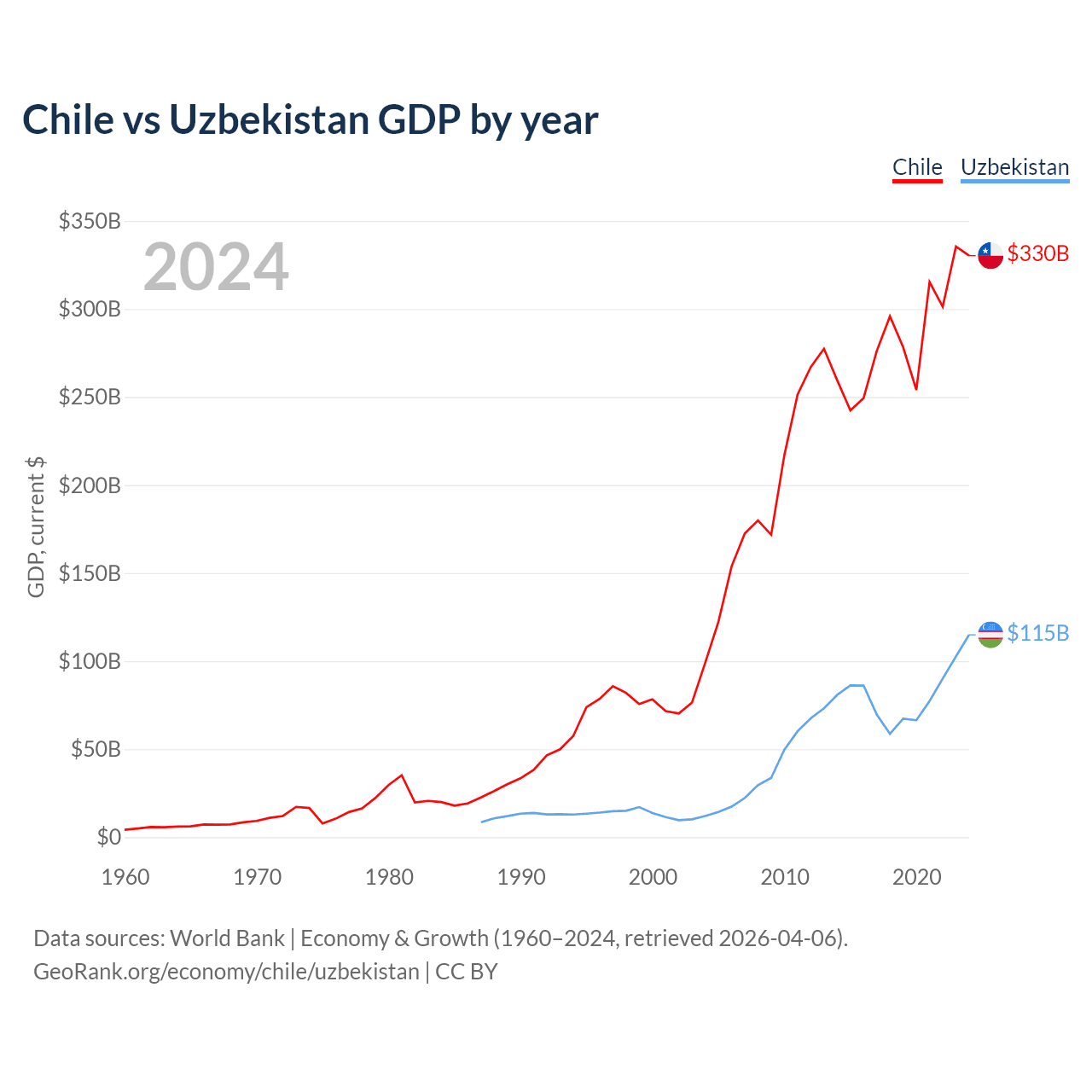 Chile has a GDP of $330B compared to $115B for Uzbekistan, ranking 45/197 and 66/197 by economy size, respectively.