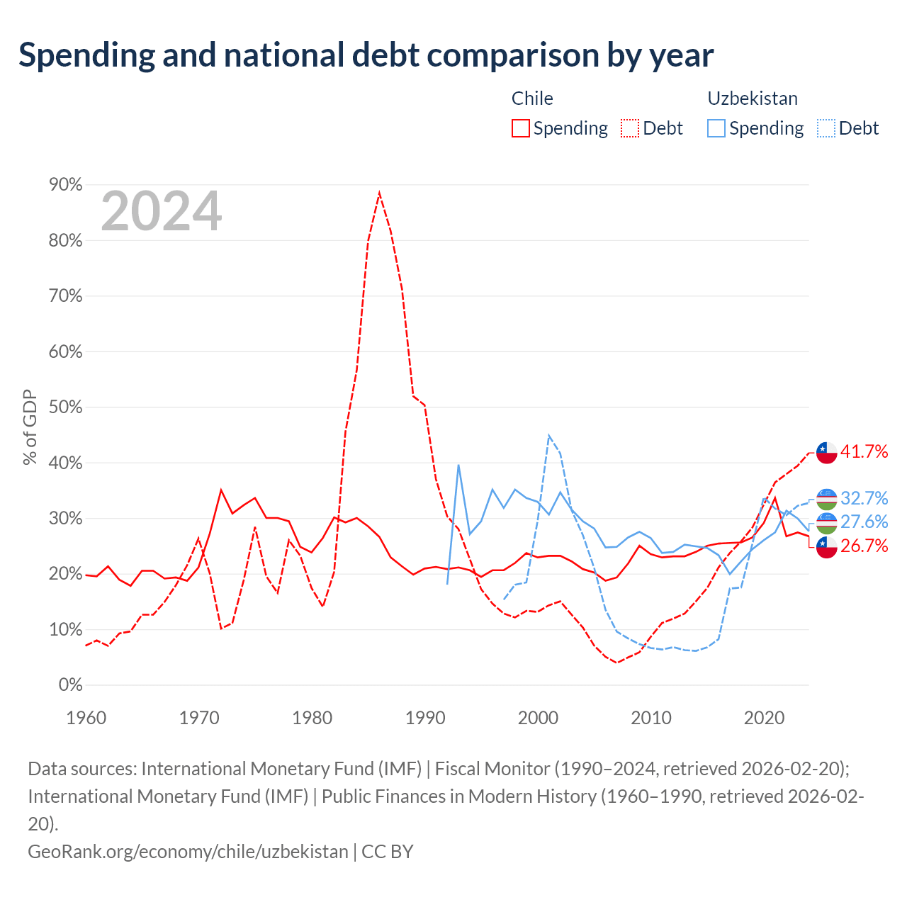 Chile has $138B in government debt (41.7% of GDP), compared to $37.5B (32.7% of GDP) in Uzbekistan.