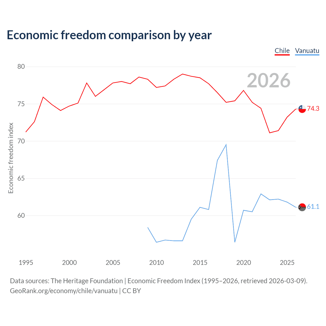 The Economic Freedom Index for Chile is 74.3, ranking 20/197, compared to 61.1 for Vanuatu, ranking 92/197. The chart above displays a comparison of annual changes in economic freedom indexes.