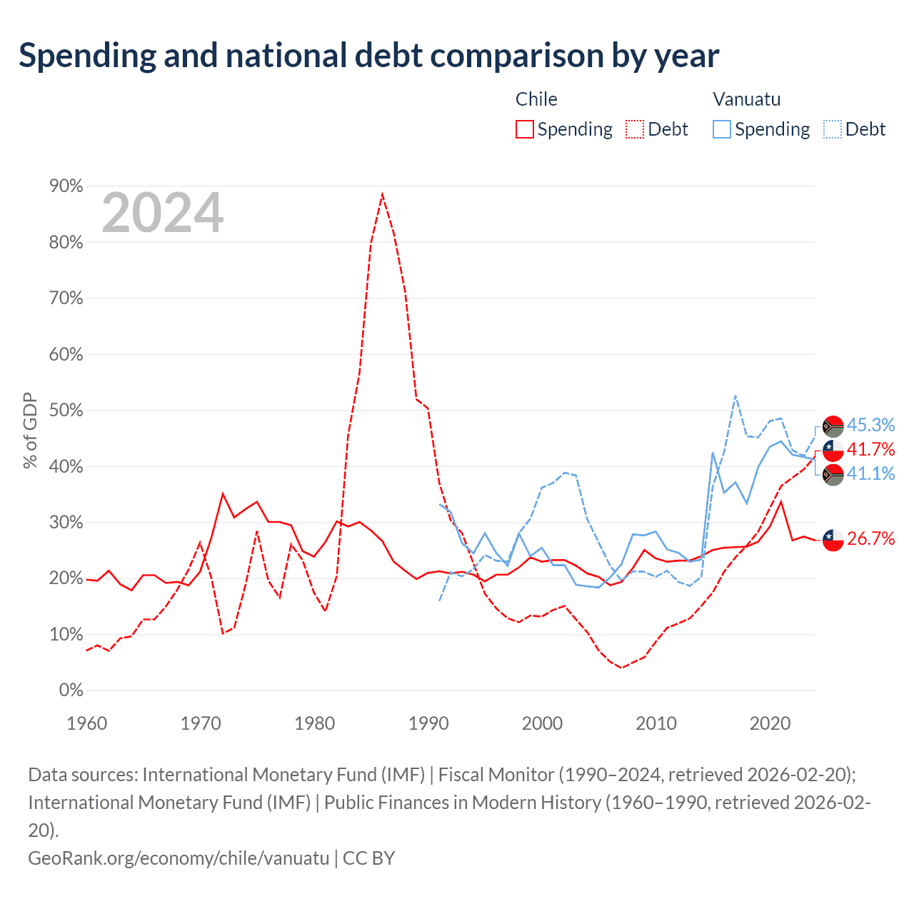Chile has $138B in government debt (41.7% of GDP), compared to $507M (45.3% of GDP) in Vanuatu.