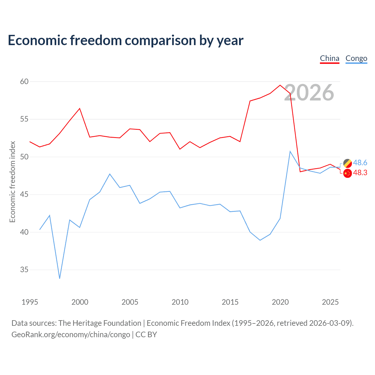 The Economic Freedom Index for China is 48.3, ranking 170/197, compared to 48.6 for the Congo, ranking 169/197. The chart above displays a comparison of annual changes in economic freedom indexes.