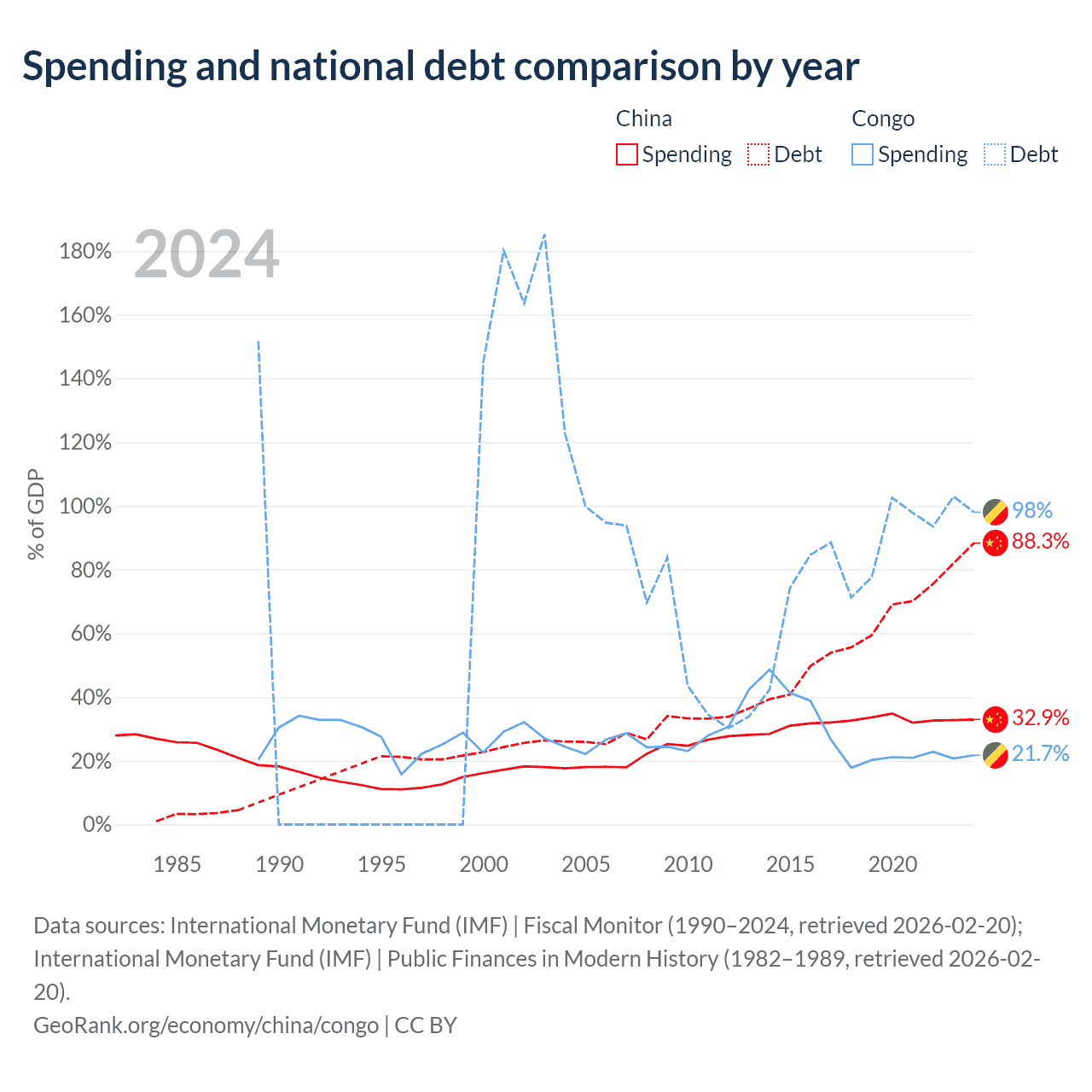 China has $16.6T in government debt (88.3% of GDP), compared to $15.4B (98% of GDP) in the Congo.