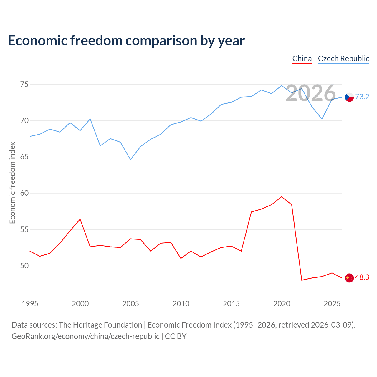 Data sources: The Heritage Foundation | Economic Freedom Index (1995–2026, retrieved 2026-03-09).