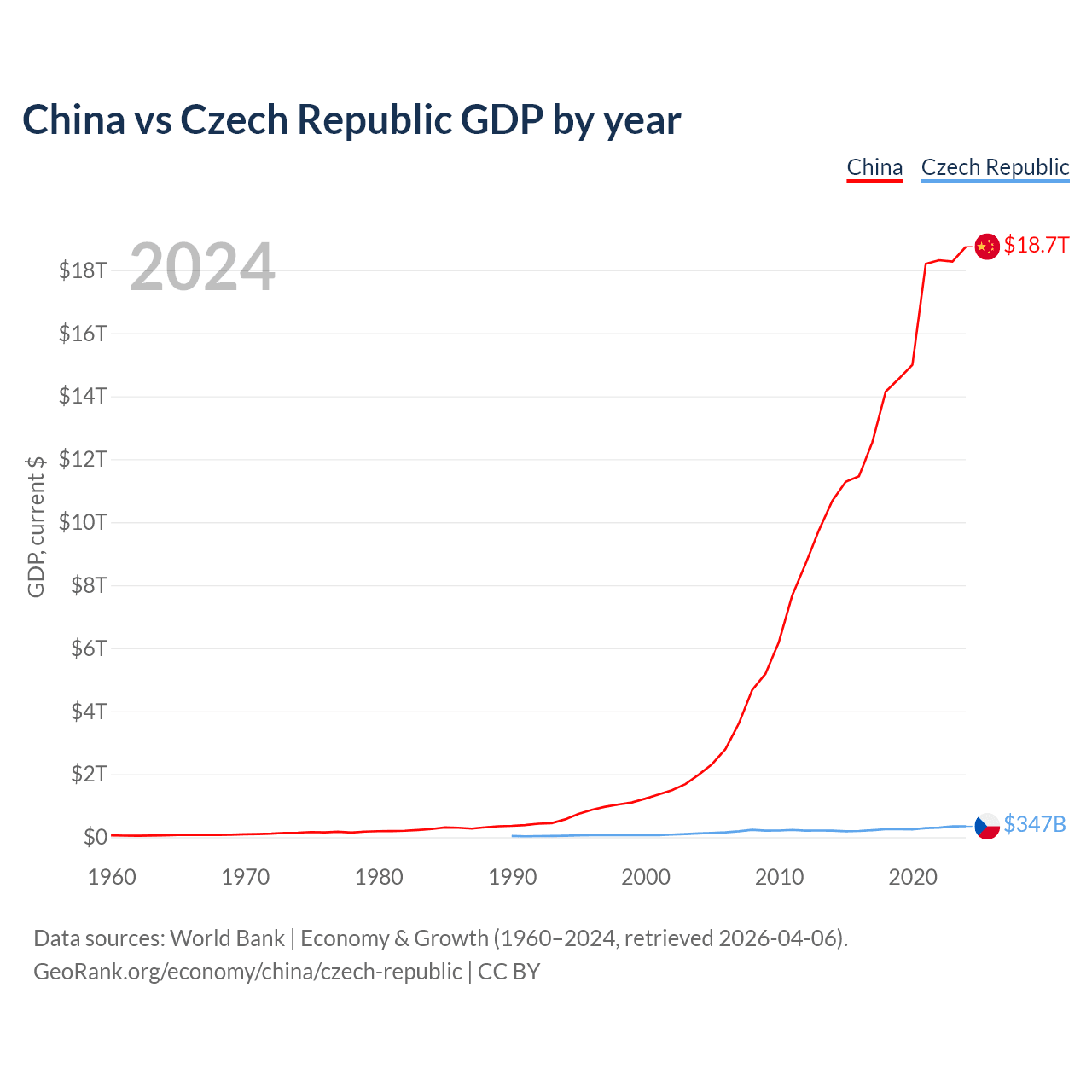 China has a GDP of $18.7T compared to $347B for the Czech Republic, ranking 2/197 and 44/197 by economy size, respectively.