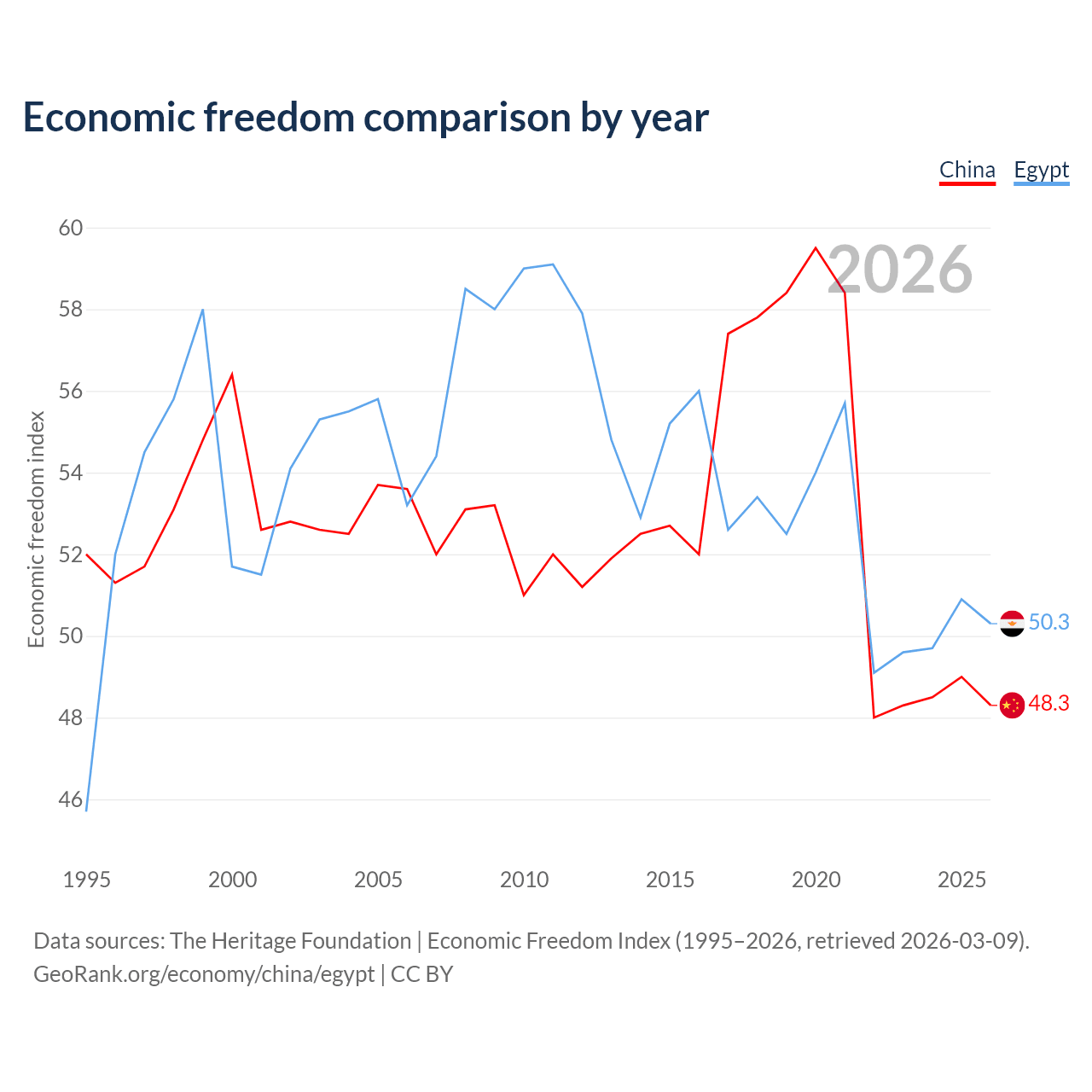 The Economic Freedom Index for China is 48.3, ranking 170/197, compared to 50.3 for Egypt, ranking 160/197. The chart above displays a comparison of annual changes in economic freedom indexes.