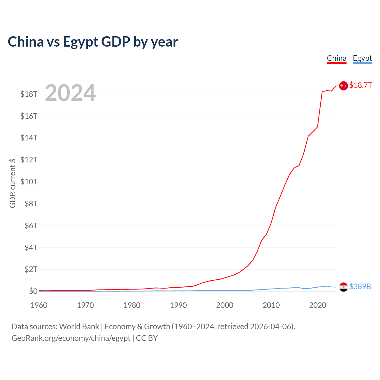 China has a GDP of $18.7T compared to $389B for Egypt, ranking 2/197 and 41/197 by economy size, respectively.