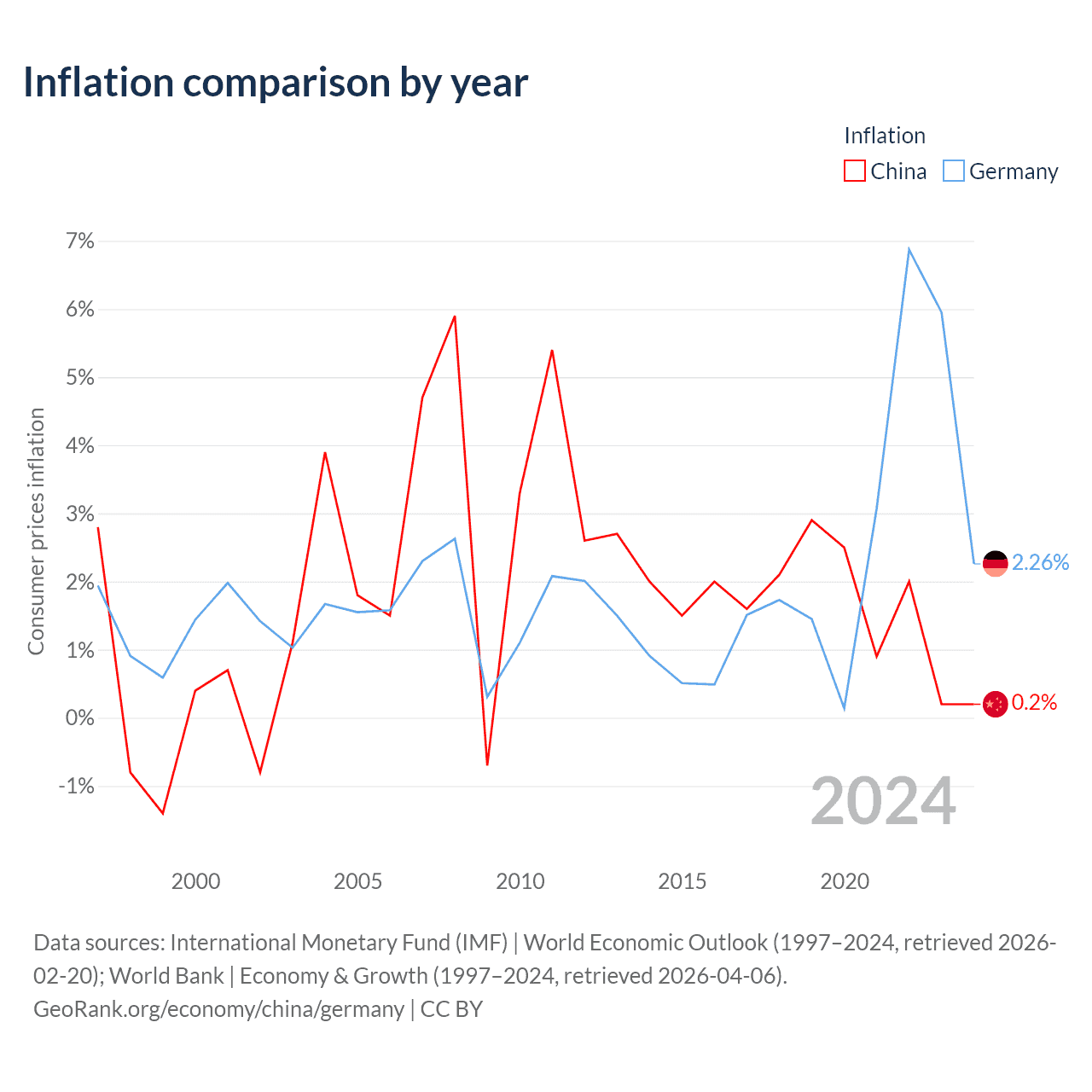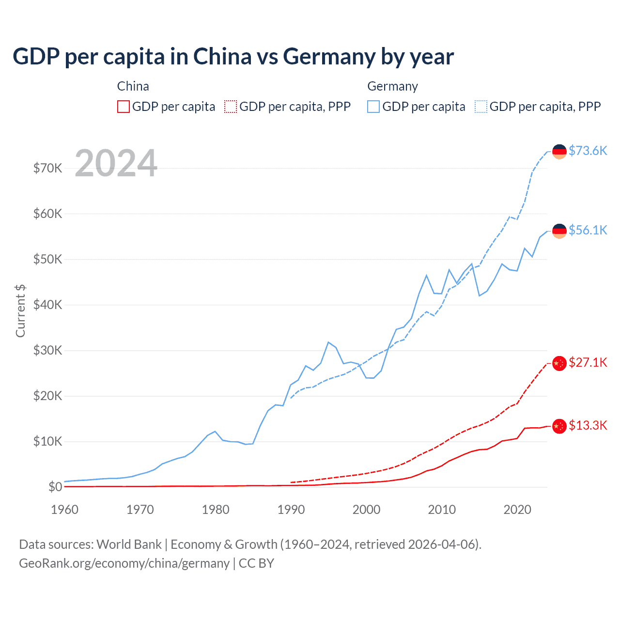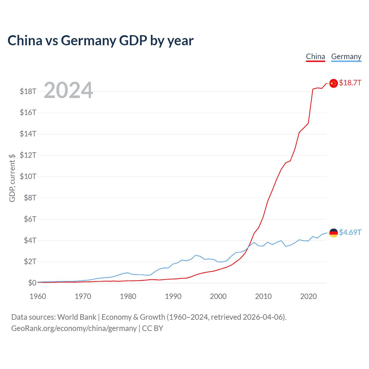China has a GDP of $18.7T compared to $4.69T for Germany, ranking 2/197 and 3/197 by economy size, respectively.