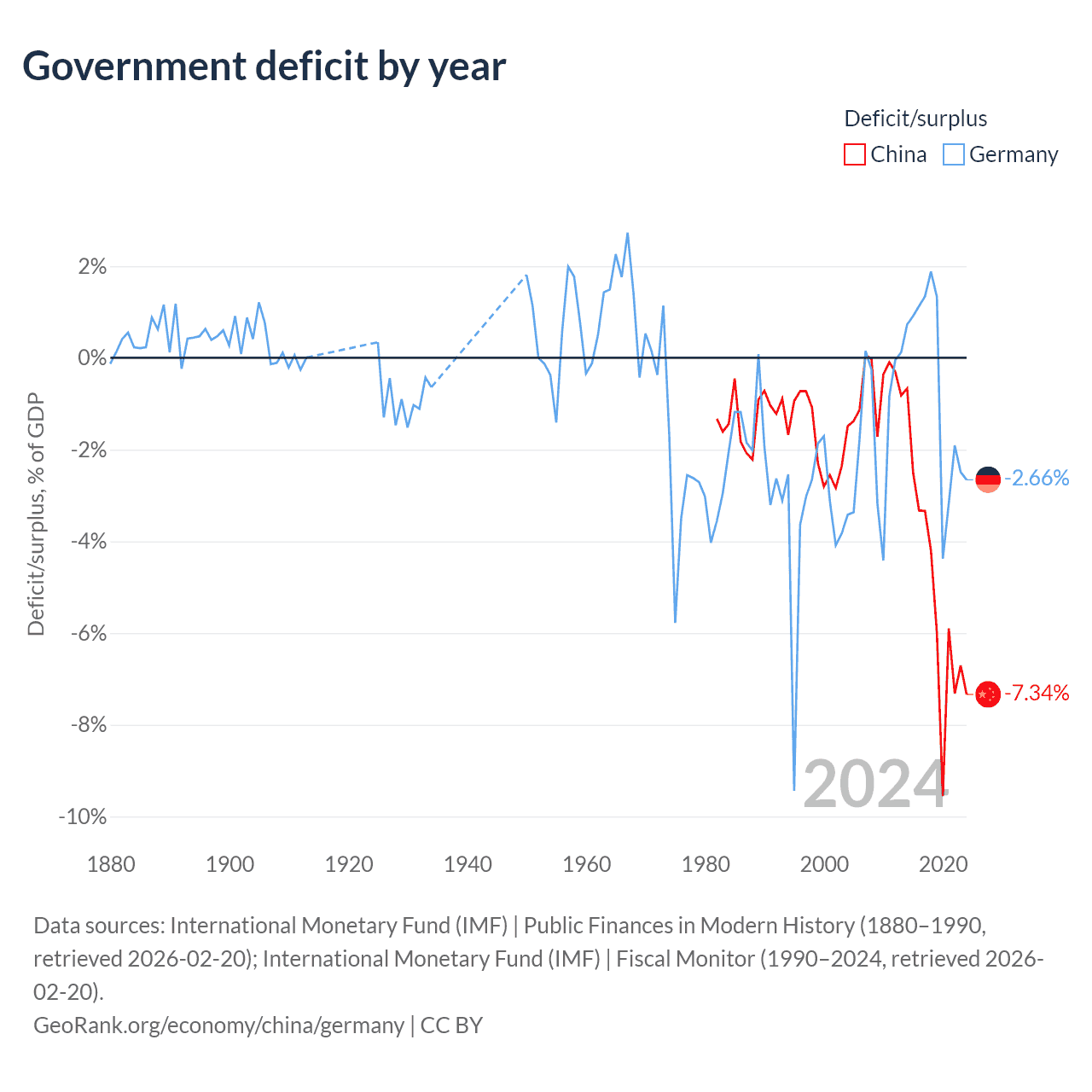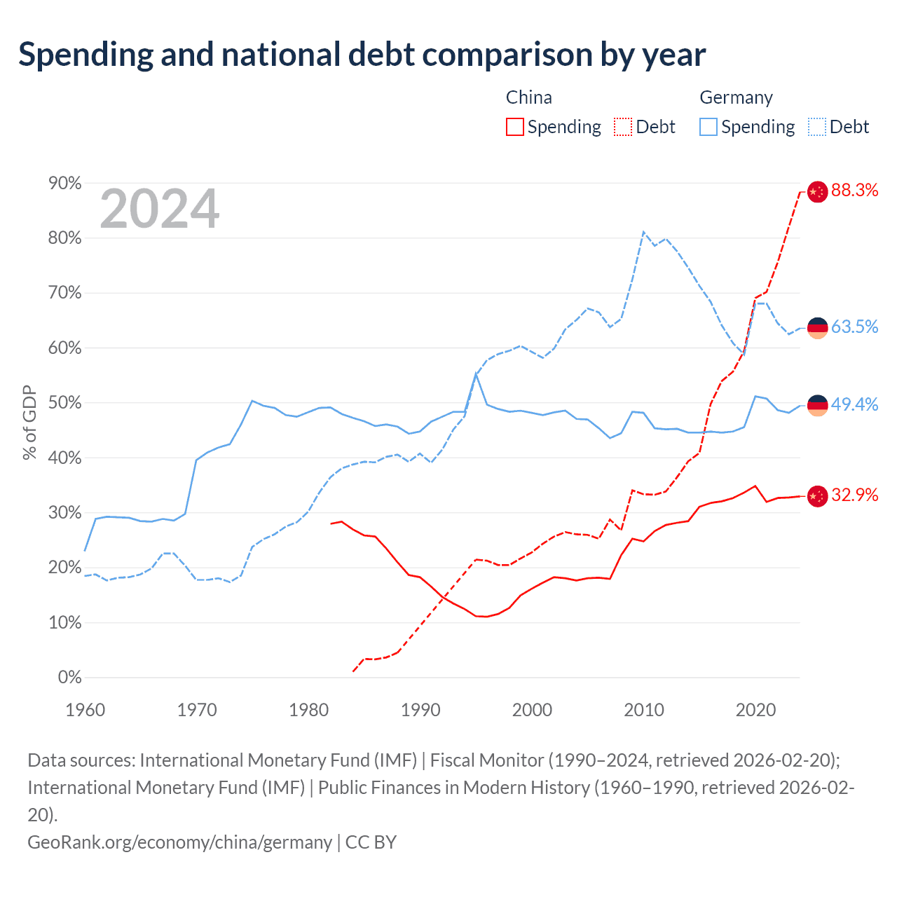 China has $16.6T in government debt (88.3% of GDP), compared to $2.97T (63.5% of GDP) in Germany.