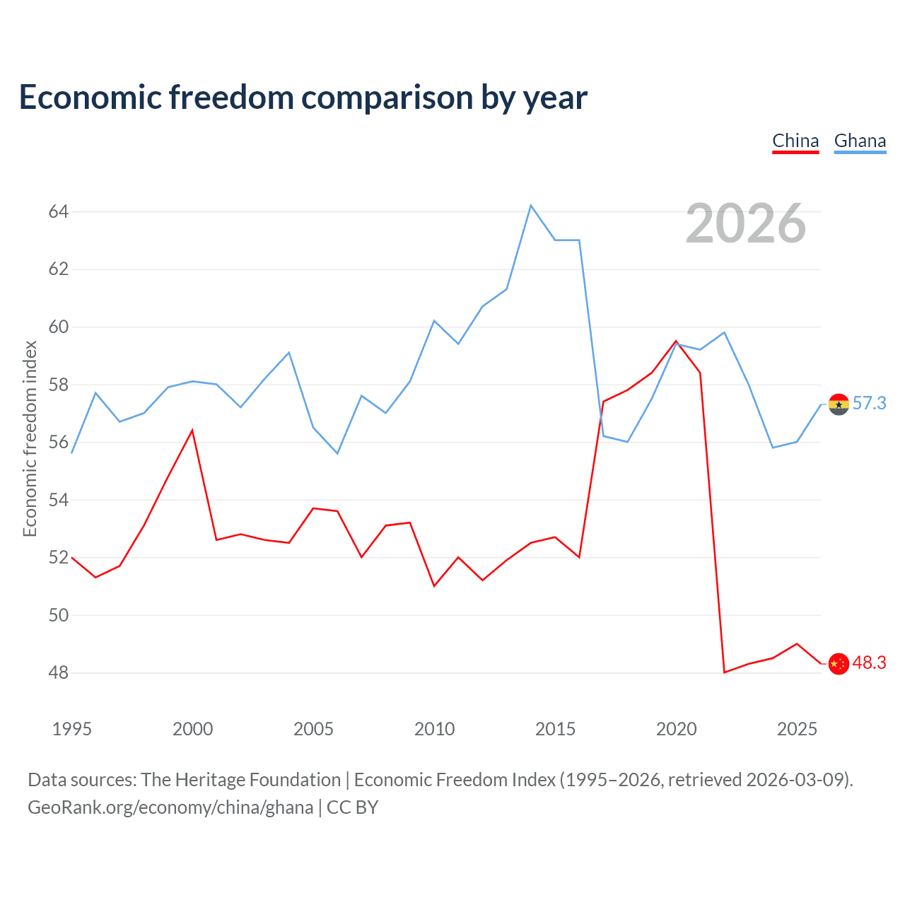 The Economic Freedom Index for China is 48.3, ranking 170/197, compared to 57.3 for Ghana, ranking 118/197. The chart above displays a comparison of annual changes in economic freedom indexes.