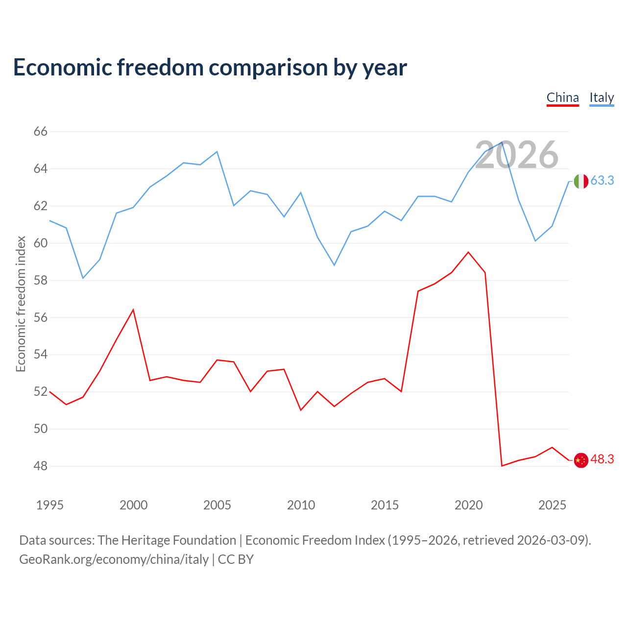 The Economic Freedom Index for China is 48.3, ranking 170/197, compared to 63.3 for Italy, ranking 80/197. The chart above displays a comparison of annual changes in economic freedom indexes.