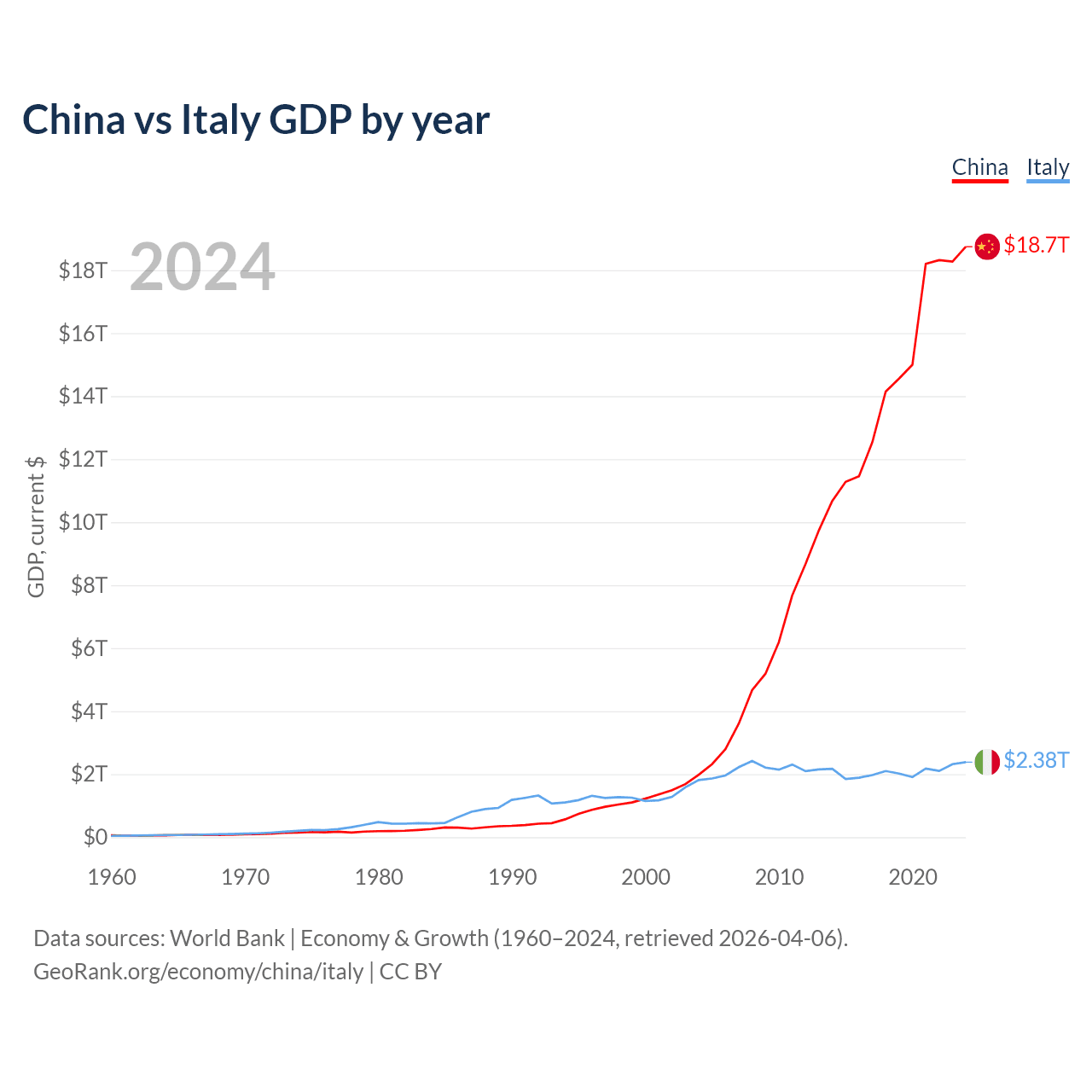 China has a GDP of $18.7T compared to $2.38T for Italy, ranking 2/197 and 8/197 by economy size, respectively.