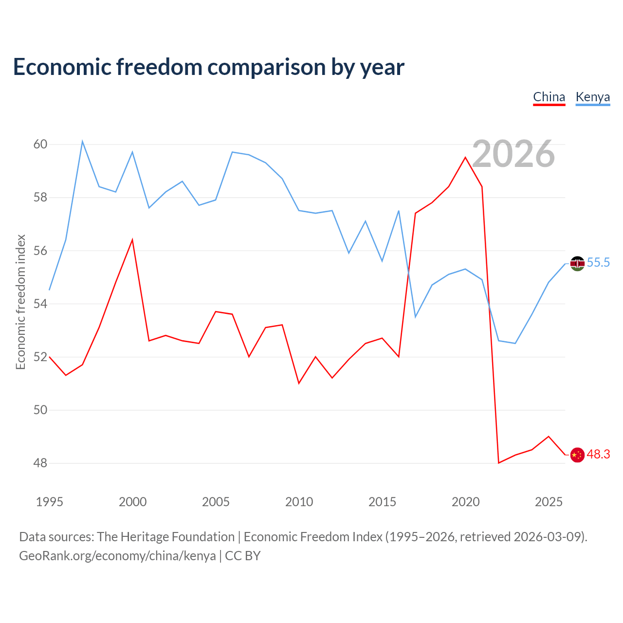 The Economic Freedom Index for China is 48.3, ranking 170/197, compared to 55.5 for Kenya, ranking 128/197. The chart above displays a comparison of annual changes in economic freedom indexes.