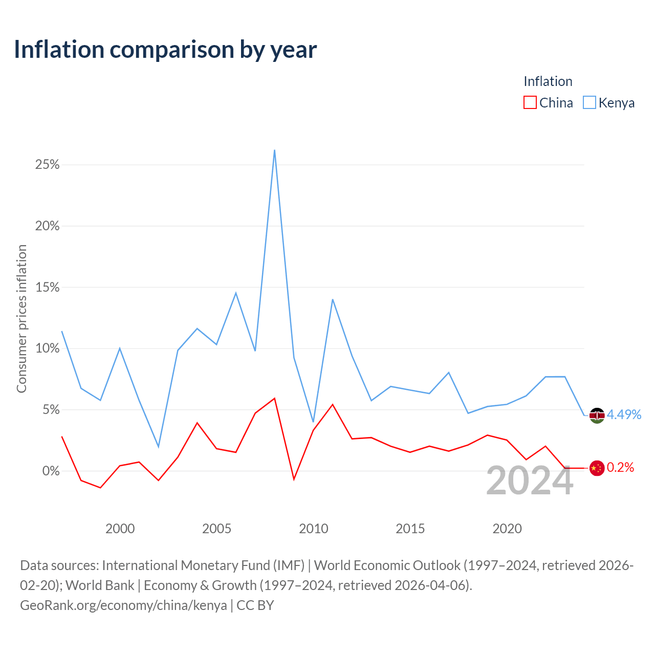 China has a GDP of $18.7T compared to $120B for Kenya, ranking 2/197 and 64/197 by economy size, respectively.