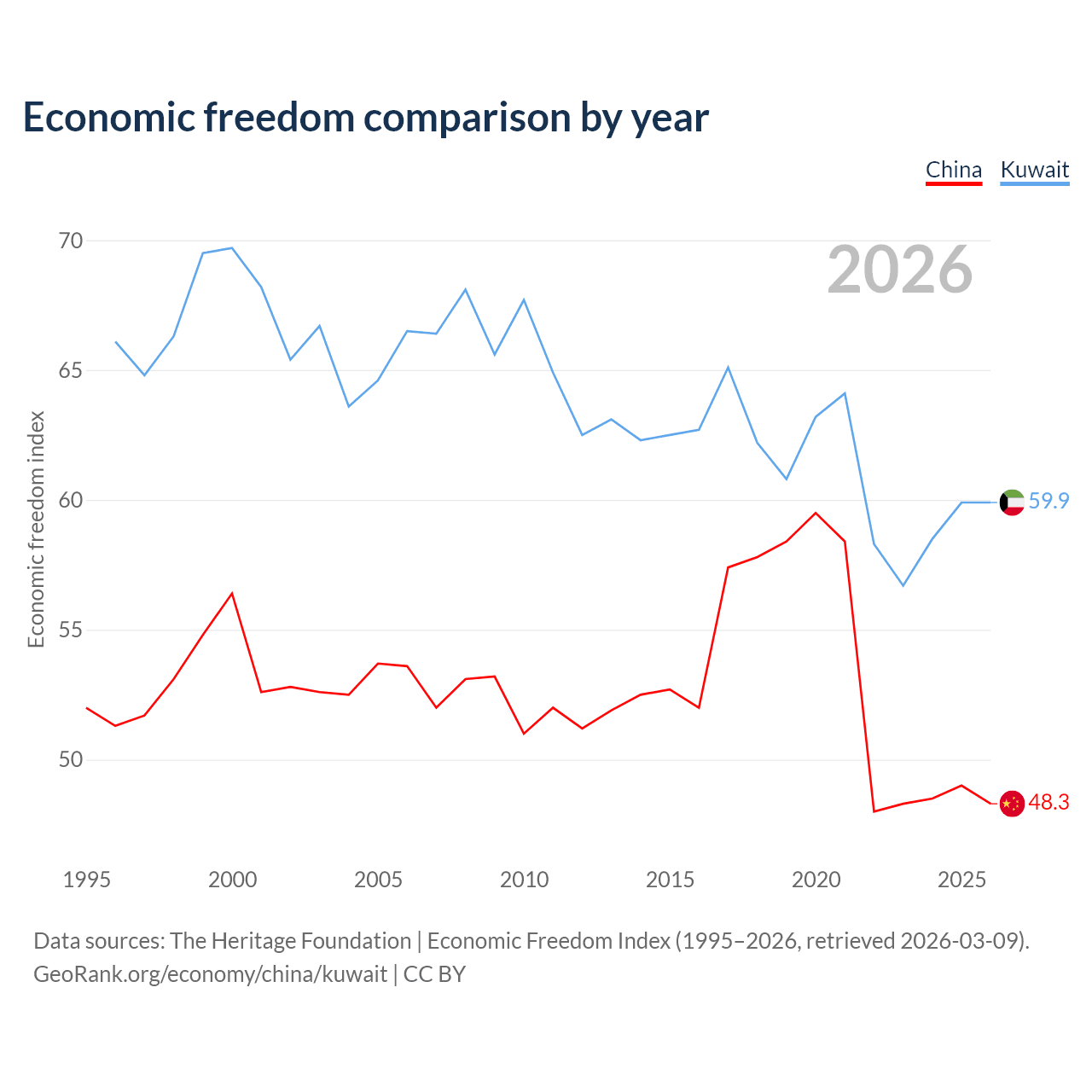 Data sources: The Heritage Foundation | Economic Freedom Index (1995–2026, retrieved 2026-03-09).