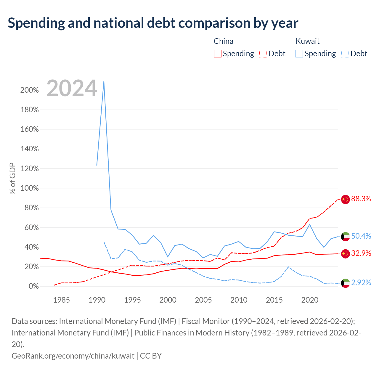China has $16.6T in government debt (88.3% of GDP), compared to $4.68B (2.92% of GDP) in Kuwait.