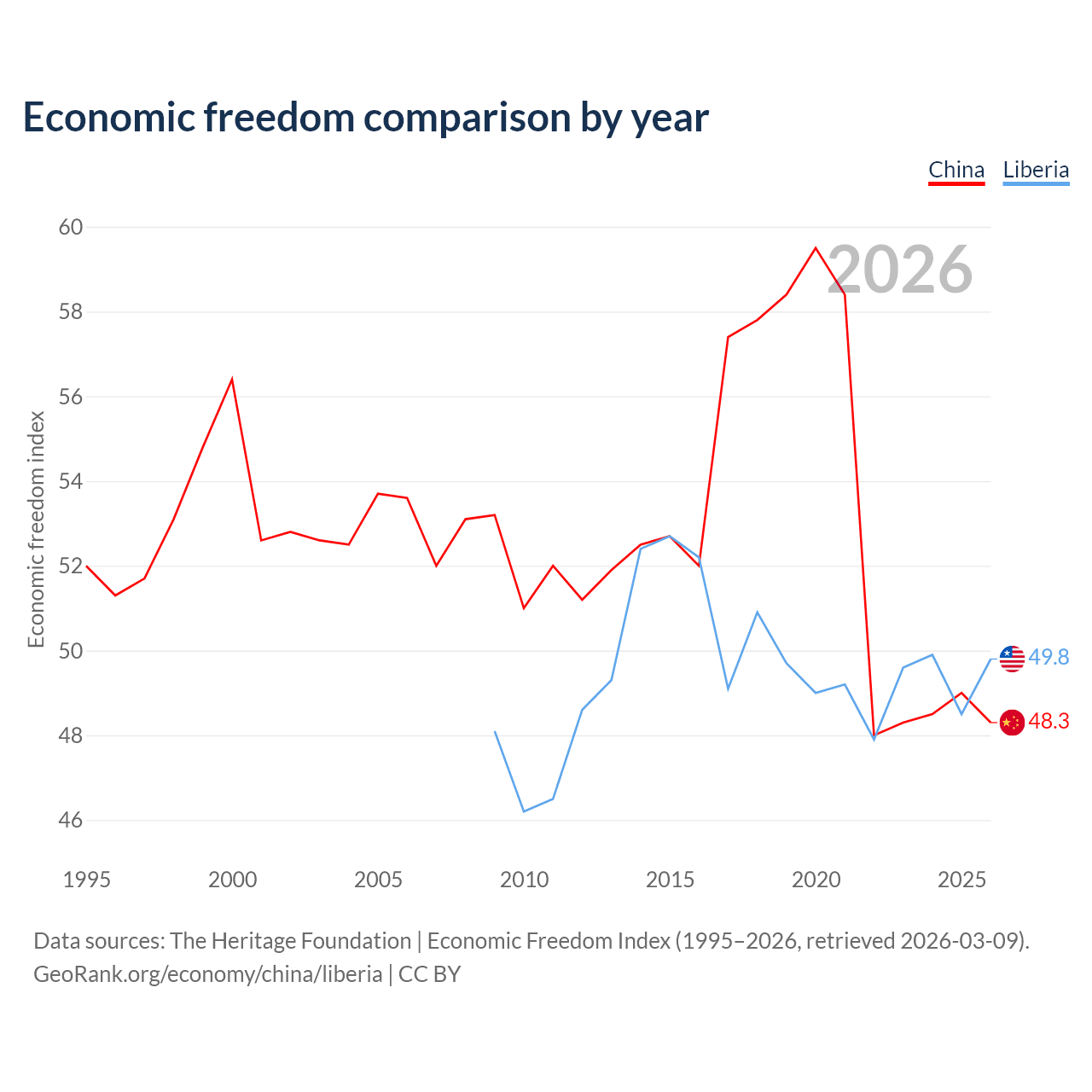 The Economic Freedom Index for China is 48.3, ranking 170/197, compared to 49.8 for Liberia, ranking 163/197. The chart above displays a comparison of annual changes in economic freedom indexes.