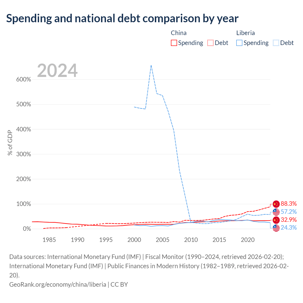China has $16.6T in government debt (88.3% of GDP), compared to $2.73B (57.2% of GDP) in Liberia.