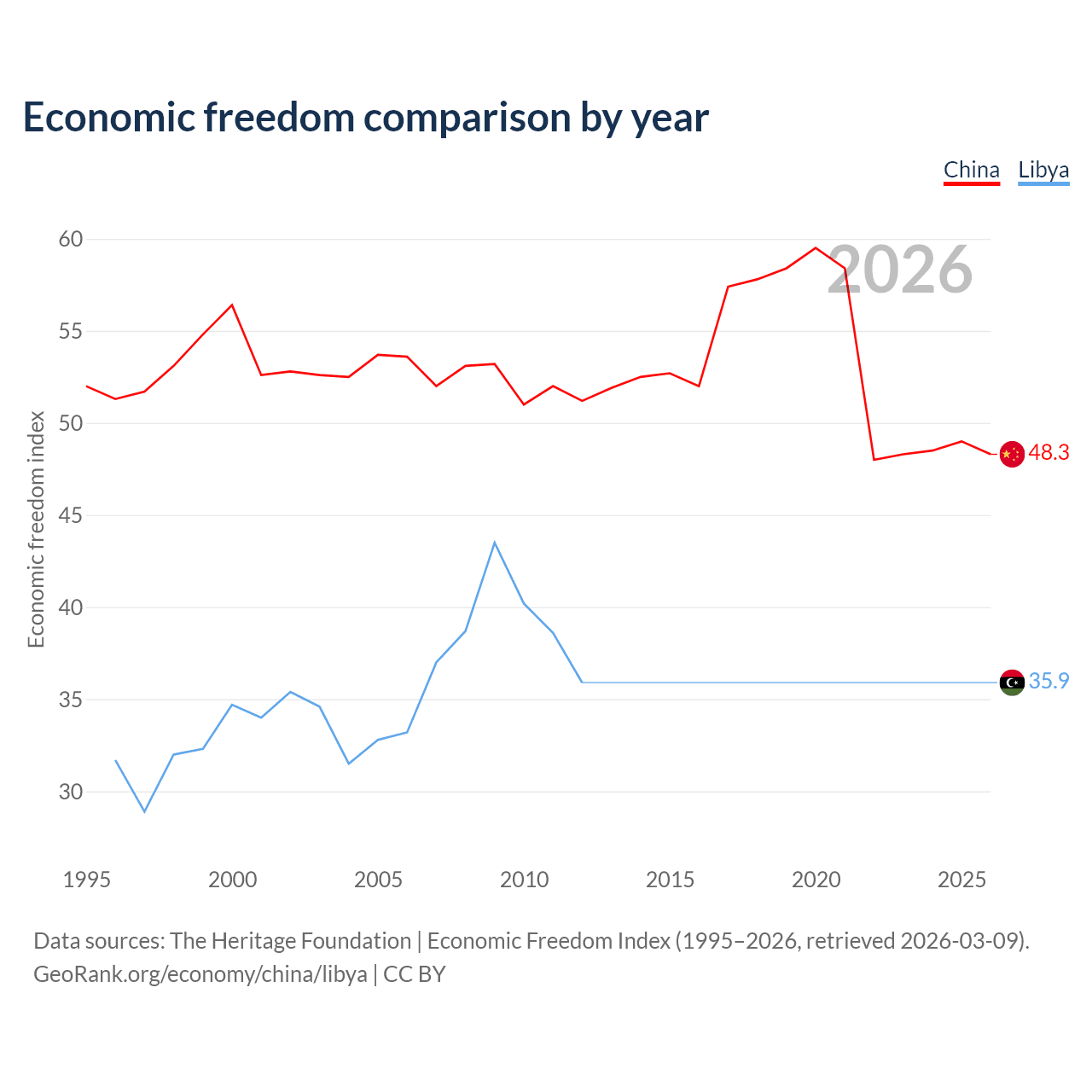 Data sources: The Heritage Foundation | Economic Freedom Index (1995–2026, retrieved 2026-03-09).
