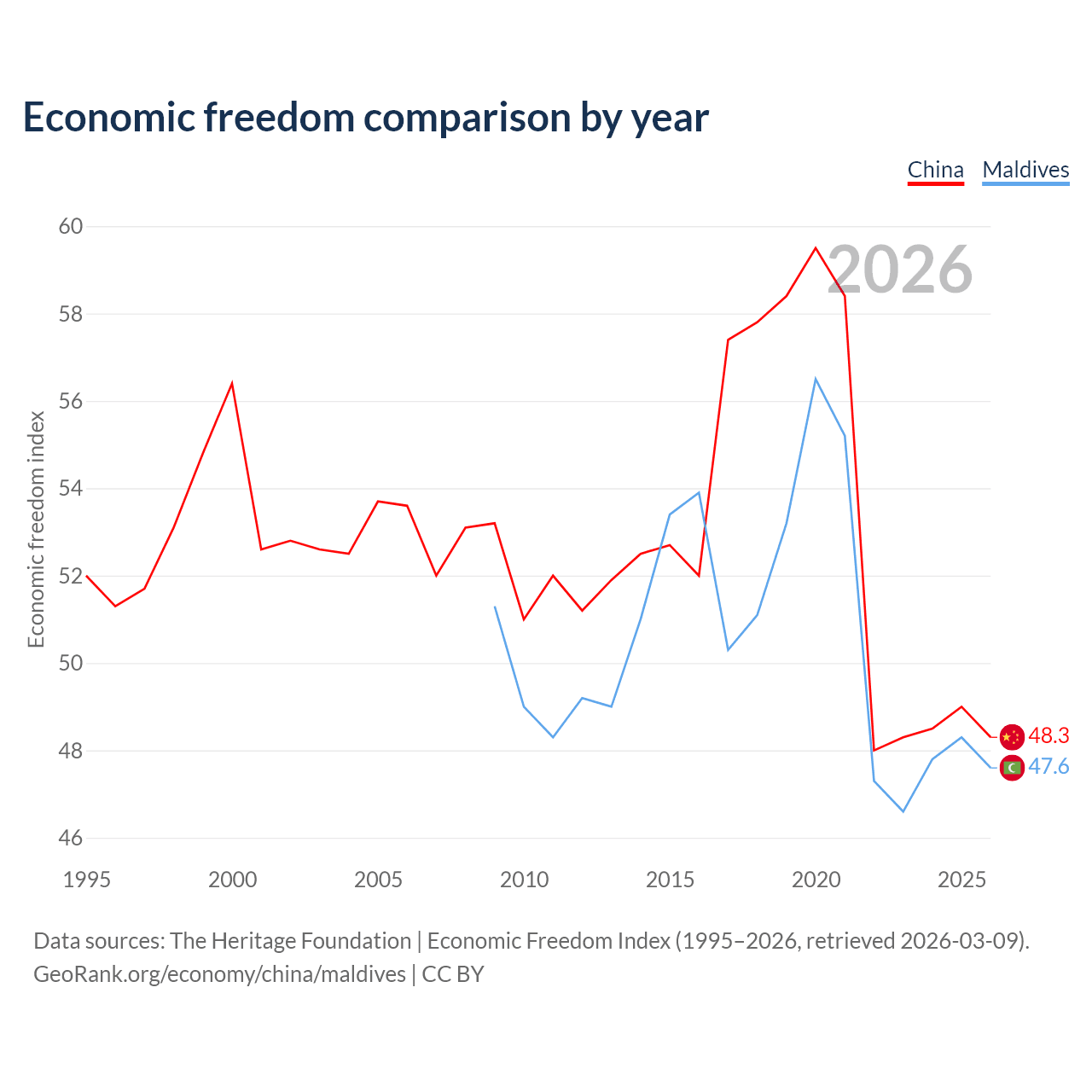 The Economic Freedom Index for China is 48.3, ranking 170/197, compared to 47.6 for Maldives, ranking 174/197. The chart above displays a comparison of annual changes in economic freedom indexes.