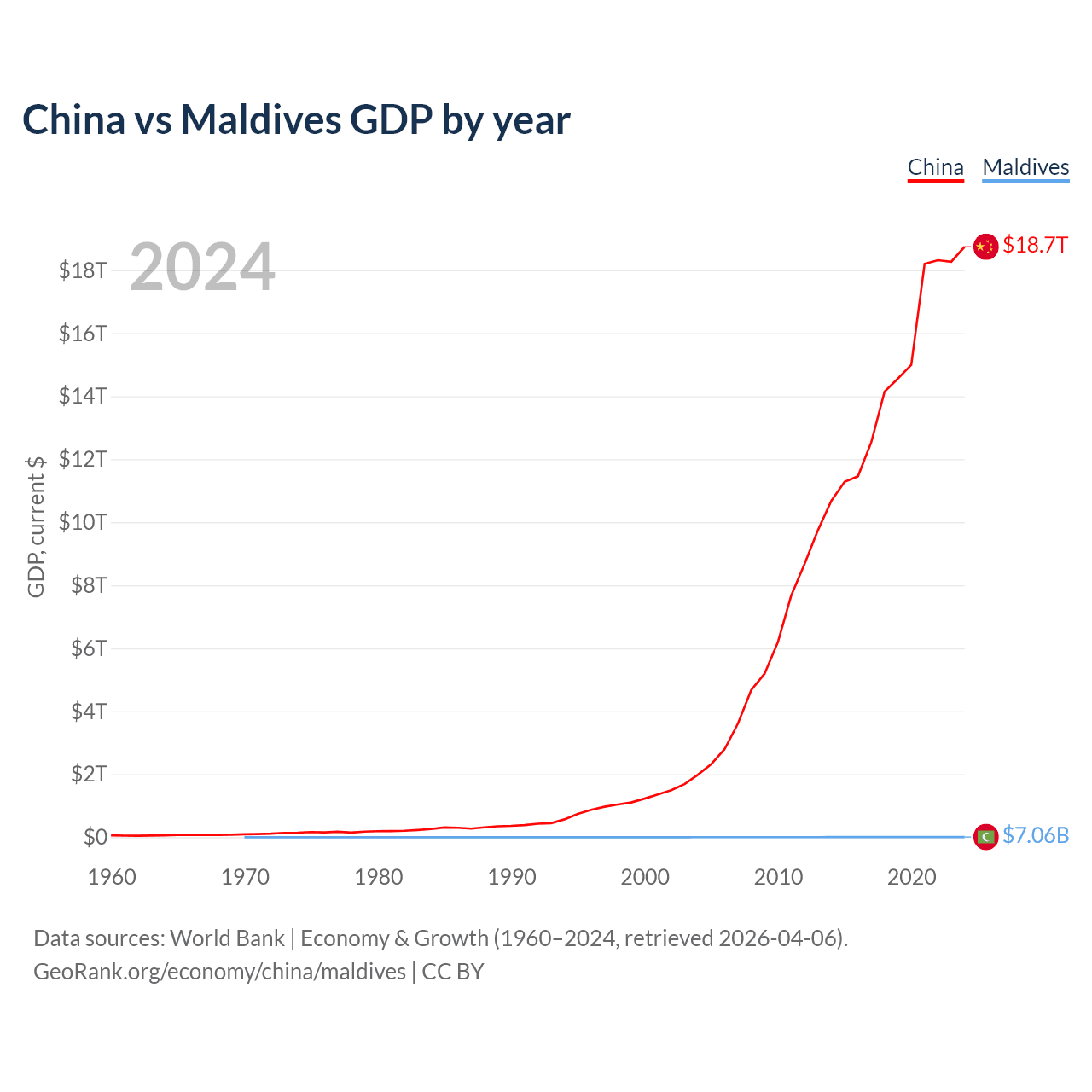 China has a GDP of $18.7T compared to $7.06B for Maldives, ranking 2/197 and 159/197 by economy size, respectively.