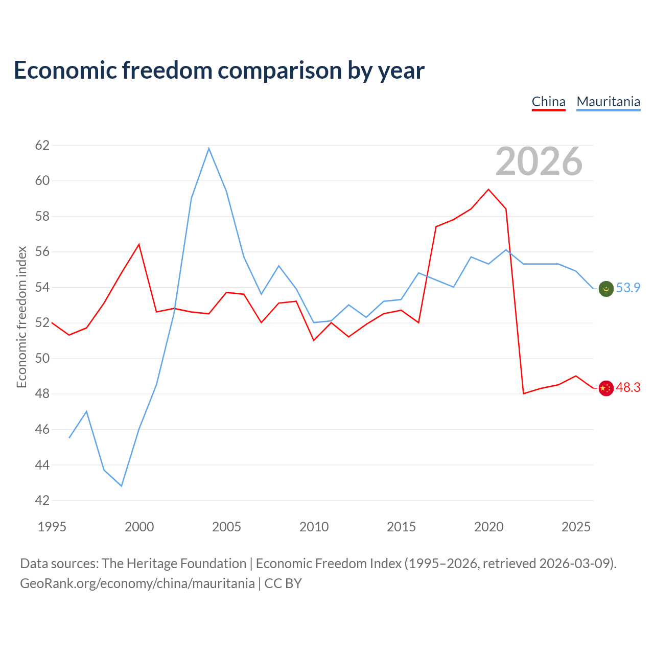 The Economic Freedom Index for China is 48.3, ranking 170/197, compared to 53.9 for Mauritania, ranking 136/197. The chart above displays a comparison of annual changes in economic freedom indexes.