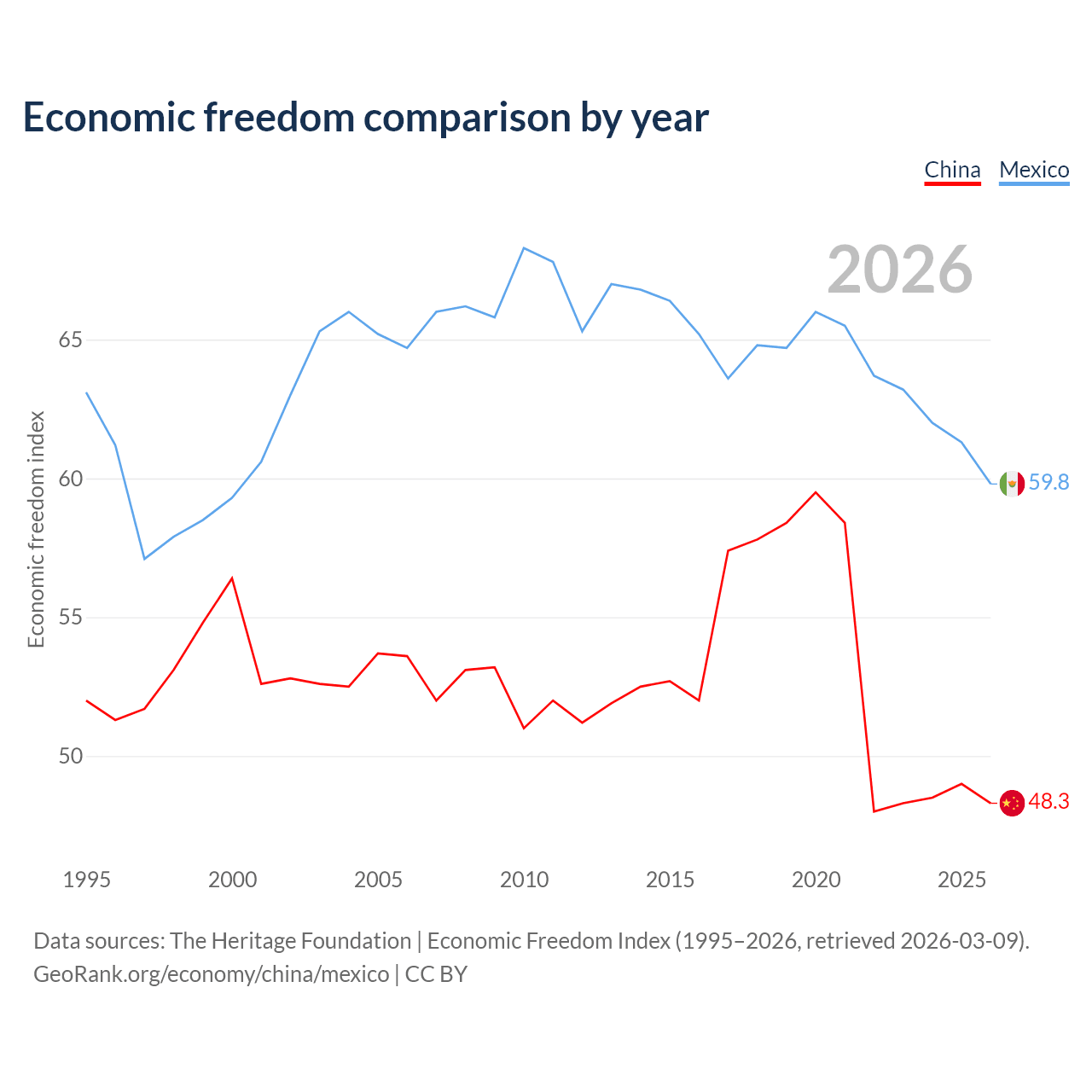 The Economic Freedom Index for China is 48.3, ranking 170/197, compared to 59.8 for Mexico, ranking 102/197. The chart above displays a comparison of annual changes in economic freedom indexes.
