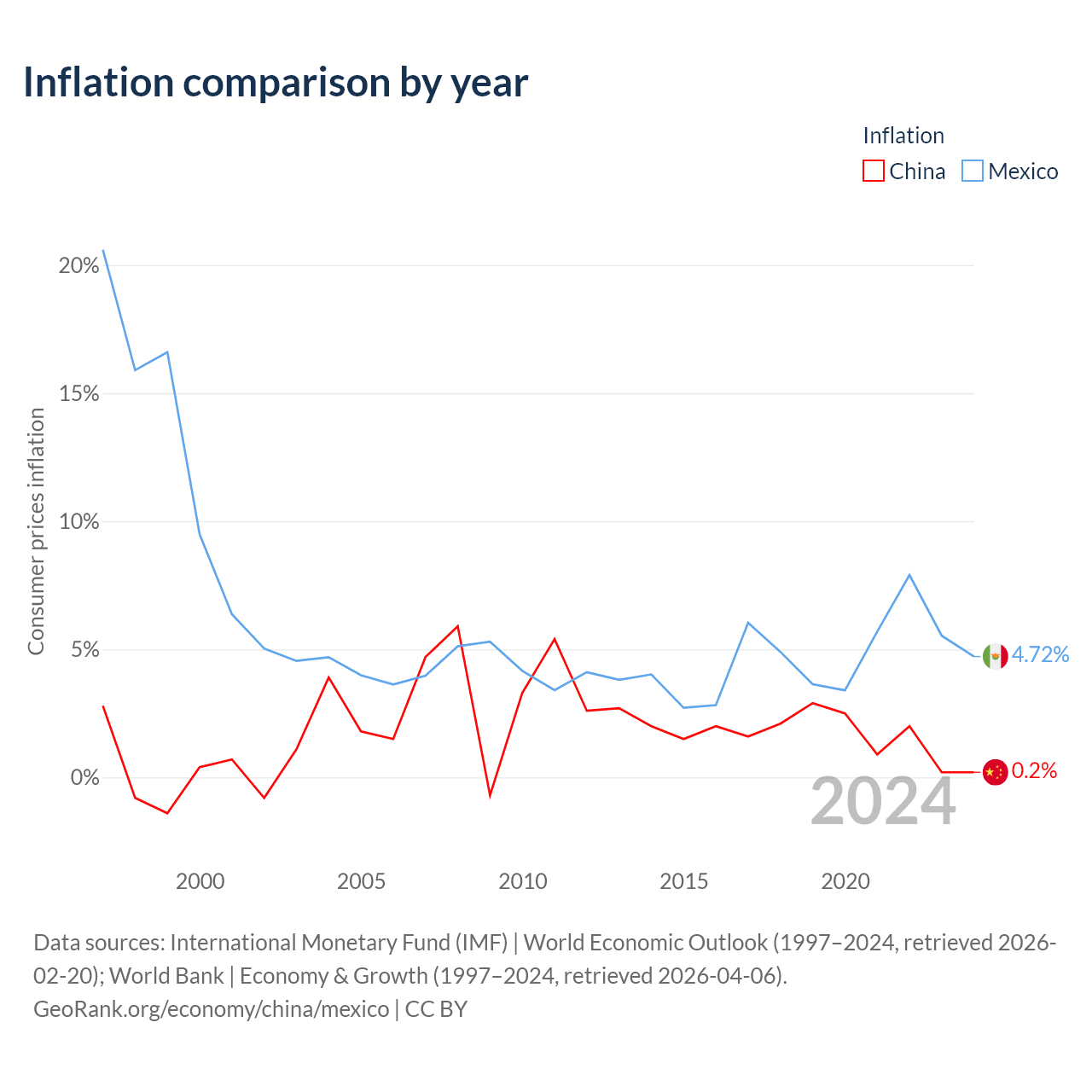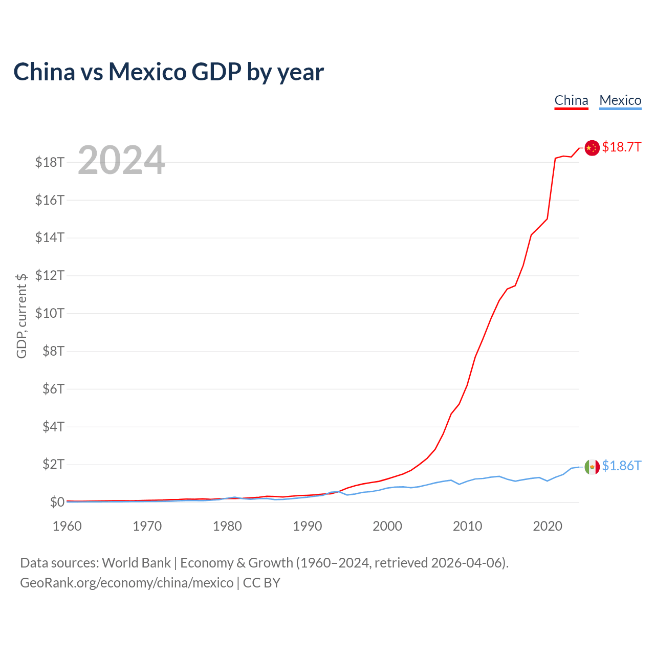 China has a GDP of $18.7T compared to $1.86T for Mexico, ranking 2/197 and 13/197 by economy size, respectively.